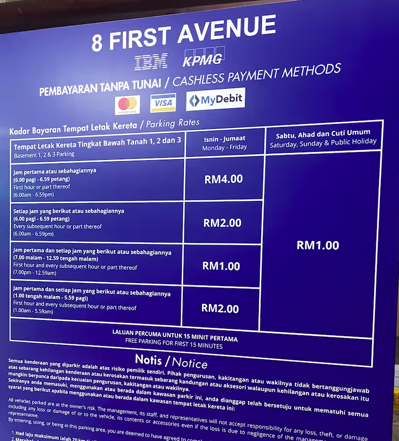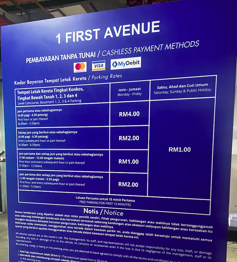 1 First Avenue / 8 First Avenue / One World Hotel’s Parking Rate Notice Share Copy URLWhatsAppFacebookTwitterLinkedinEmail 1 First Avenue 8 First Avenue One World Hotel More Info Share Copy URLWhatsAppFacebookTwitterLinkedinEmail Subscribe Notify of new follow-up comments new replies to my comments Label {} [+] Name* Email* Label {} [+] Name* Email* 0 Comments Oldest Newest Most Voted Inline Feedbacks View all comments Info Difference Between “Reserved” and “Non-Reserved” Monthly Pass Parking in Malaysia How much TnG balance is required for parking in Malaysia Can you use MyKad’s TnG for parking payments? Can You Use Your Bankcard To Exit Parking If Your T&G Card Has Insufficient Balance?