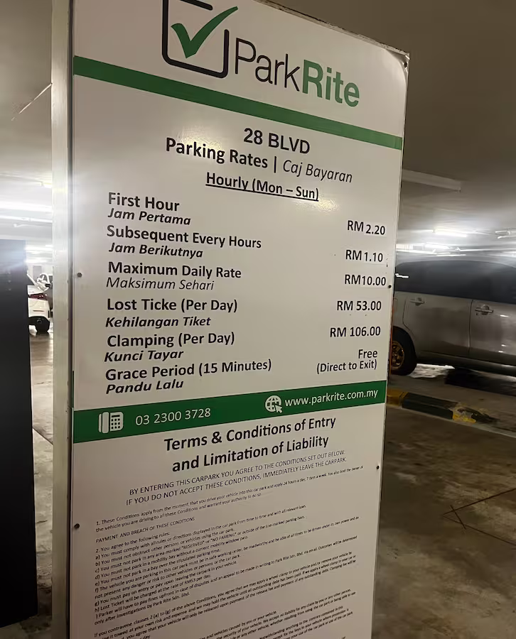 28 Boulevard’s Parking Rate Notice Share Copy URLWhatsAppFacebookTwitterLinkedinEmail Last Updated On March 3, 2026 More Info Nearby Car Parks is only available for our subscribers. More Info Share Copy URLWhatsAppFacebookTwitterLinkedinEmail Subscribe Notify of new follow-up comments new replies to my comments Label {} [+] Name* Email* Label {} [+] Name* Email* 0 Comments Oldest Newest Most Voted Inline Feedbacks View all comments Info Is 15 Minutes Grace Period Included in the First Hour of Parking? What Is Cut-Off Time in a Parking Rate Notice RM10.00 or RM20.00 Charged Instead of Normal Parking Rate? Can You Use Your Bankcard To Exit Parking If Your T&G Card Has Insufficient Balance? Can you use MyKad’s TnG for parking payments?