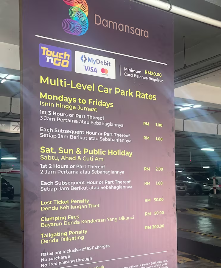 3 Damansara Mall Parking Rate Board Share Copy URLWhatsAppFacebookTwitterLinkedinEmail Last Updated on June 1, 2025 by Parking Malaysia May 2025 © parkinginmalaysia.com © parkinginmalaysia.com Back Share Copy URLWhatsAppFacebookTwitterLinkedinEmail Subscribe Notify of new follow-up comments new replies to my comments Label {} [+] Name* Email* Label {} [+] Name* Email* 0 Comments Oldest Newest Most Voted Inline Feedbacks View all comments Info Difference Between “Reserved” and “Non-Reserved” Monthly Pass Parking in Malaysia How much TnG balance is required for parking in Malaysia Can you use MyKad’s TnG for parking payments? Can You Use Your Bankcard To Exit Parking If Your T&G Card Has Insufficient Balance?