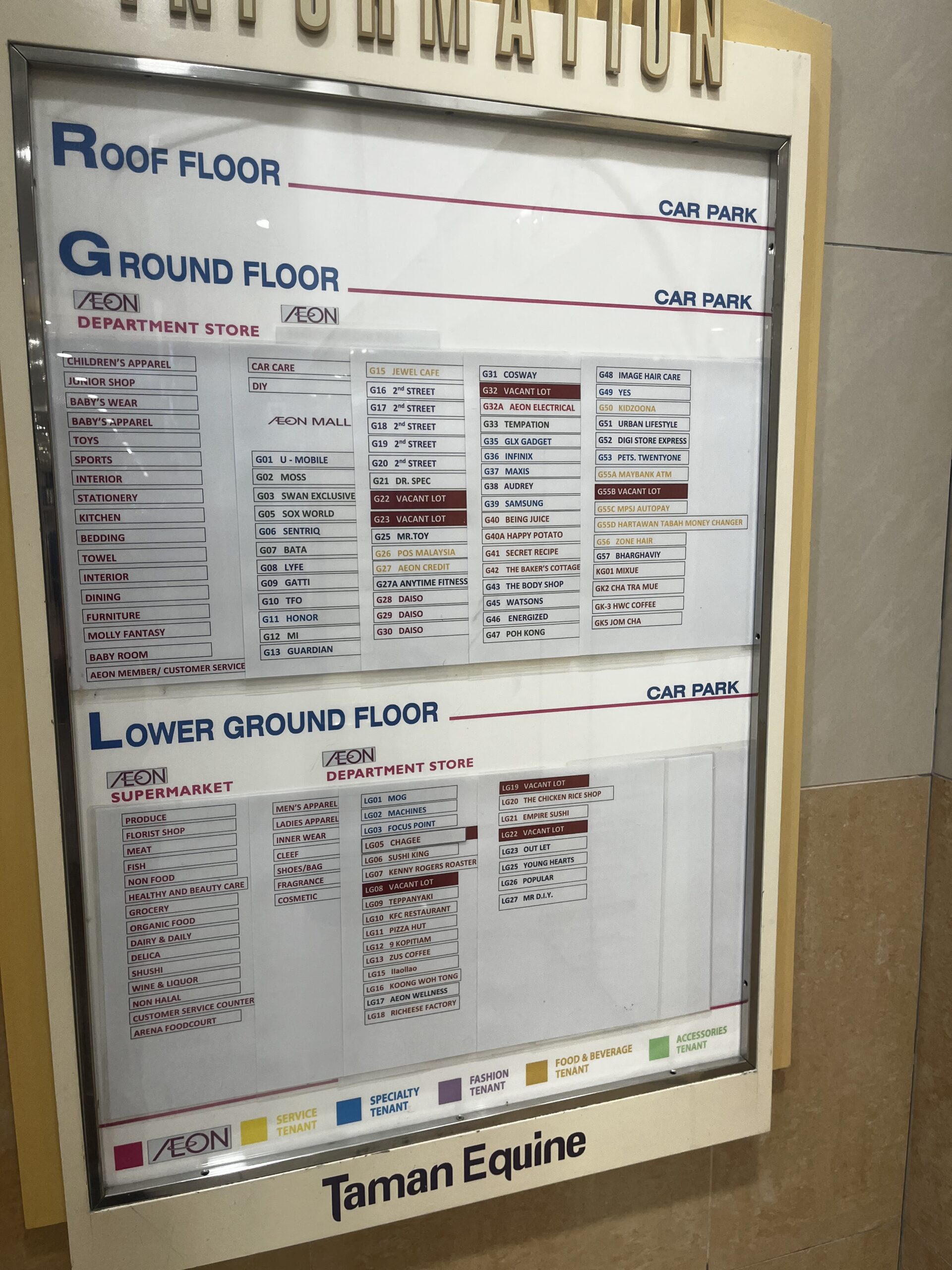 Aeon Taman Equine’s Mall Directory Share Copy URLWhatsAppFacebookTwitterLinkedinEmail Floor Plan © parkinginmalaysia.com Tenant Directory © parkinginmalaysia.com More Info Share Copy URLWhatsAppFacebookTwitterLinkedinEmail Subscribe Notify of new follow-up comments new replies to my comments Label {} [+] Name* Email* Label {} [+] Name* Email* 0 Comments Oldest Newest Most Voted Inline Feedbacks View all comments Info Difference Between “Reserved” and “Non-Reserved” Monthly Pass Parking in Malaysia How much TnG balance is required for parking in Malaysia Can you use MyKad’s TnG for parking payments? Can You Use Your Bankcard To Exit Parking If Your T&G Card Has Insufficient Balance?