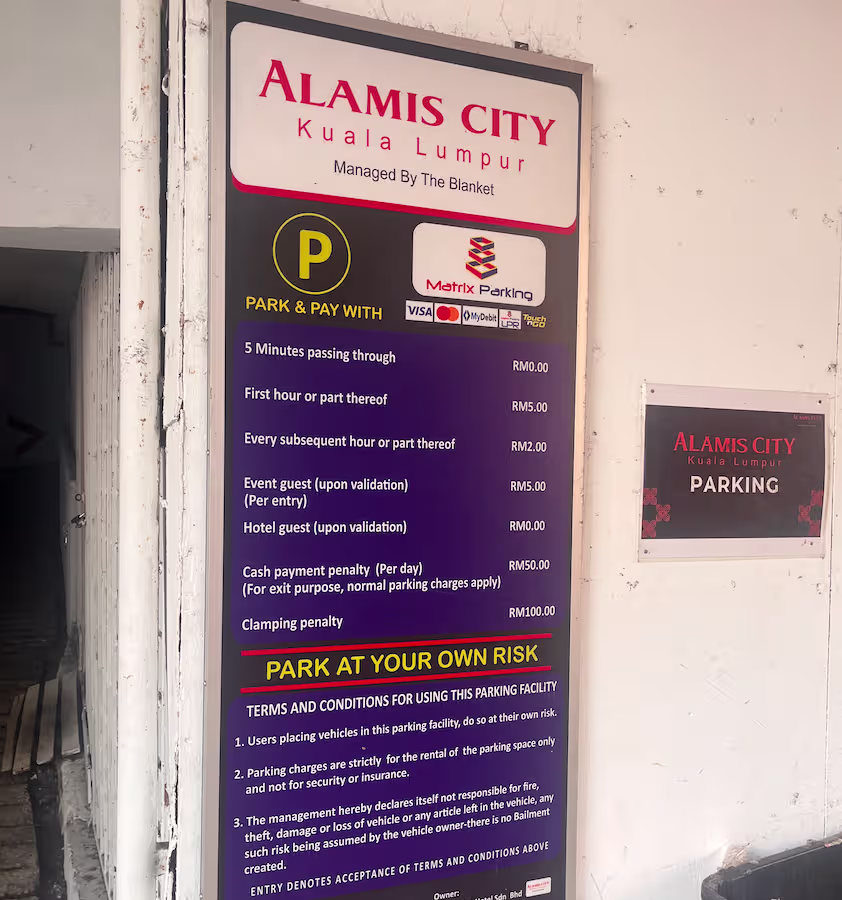 Alamis City Hotel’s Parking Rate Notice Share Copy URLWhatsAppFacebookXLinkedinEmail Last Updated On March 23, 2026 More Info Upload New Name *Email Address *Upload File(s) *Drag and Drop (or) Choose FilesSubmit Share Copy URLWhatsAppFacebookXLinkedinEmail Nearby car parks is only for subscribers. More info here Subscribe Notify of new follow-up comments new replies to my comments Label {} [+] Name* Email* Label {} [+] Name* Email* 0 Comments Oldest Newest Most Voted Inline Feedbacks View all comments Info Is 15 Minutes Grace Period Included in the First Hour of Parking? What Is Cut-Off Time in a Parking Rate Notice RM10.00 or RM20.00 Charged Instead of Normal Parking Rate? Can You Use Your Bankcard To Exit Parking If Your T&G Card Has Insufficient Balance? Can you use MyKad’s TnG for parking payments?