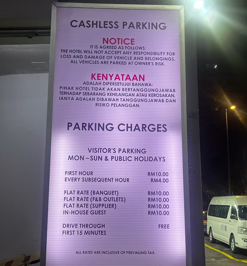 AnCasa Hotel’s Parking Rate Board Share Copy URLWhatsAppFacebookTwitterLinkedinEmail © parkinginmalaysia.com Back Share Copy URLWhatsAppFacebookTwitterLinkedinEmail Subscribe Notify of new follow-up comments new replies to my comments Label {} [+] Name* Email* Label {} [+] Name* Email* 0 Comments Oldest Newest Most Voted Inline Feedbacks View all comments Info Difference Between “Reserved” and “Non-Reserved” Monthly Pass Parking in Malaysia How much TnG balance is required for parking in Malaysia Can you use MyKad’s TnG for parking payments? Can You Use Your Bankcard To Exit Parking If Your T&G Card Has Insufficient Balance?