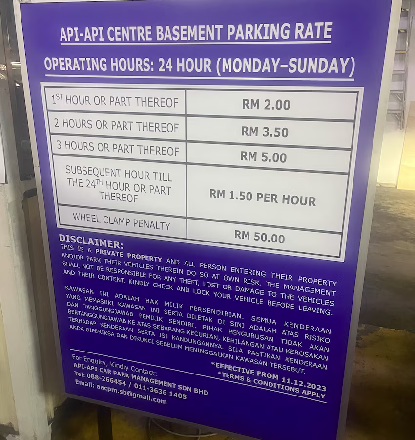 Api-Api Centre’s Parking Rate Board Share Copy URLWhatsAppFacebookTwitterLinkedinEmail Last Updated on October 31, 2025 by Parking Malaysia © parkinginmalaysia.com Back Share Copy URLWhatsAppFacebookTwitterLinkedinEmail Subscribe Notify of new follow-up comments new replies to my comments Label {} [+] Name* Email* Label {} [+] Name* Email* 0 Comments Oldest Newest Most Voted Inline Feedbacks View all comments Info Difference Between “Reserved” and “Non-Reserved” Monthly Pass Parking in Malaysia How much TnG balance is required for parking in Malaysia Can you use MyKad’s TnG for parking payments? Can You Use Your Bankcard To Exit Parking If Your T&G Card Has Insufficient Balance?