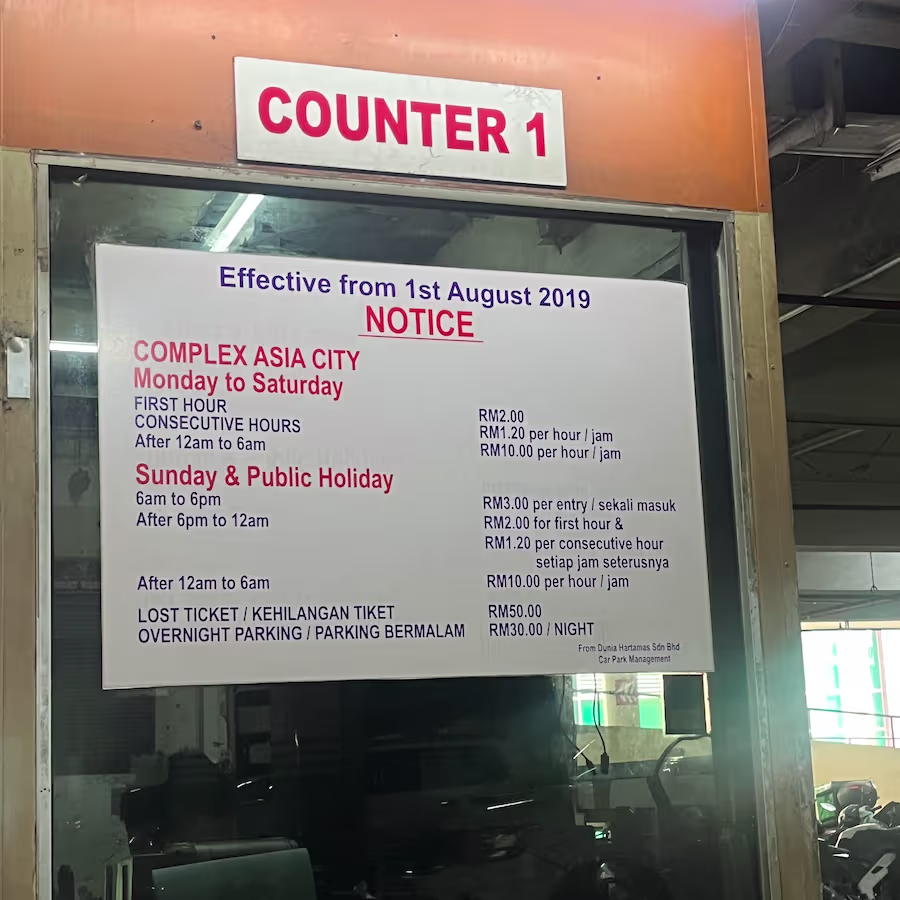 Asia City Complex’s Parking Rate Notice Share Copy URLWhatsAppFacebookTwitterLinkedinEmail Last Updated on November 19, 2025 by Parking Malaysia © parkinginmalaysia.com Back Share Copy URLWhatsAppFacebookTwitterLinkedinEmail Subscribe Notify of new follow-up comments new replies to my comments Label {} [+] Name* Email* Label {} [+] Name* Email* 0 Comments Oldest Newest Most Voted Inline Feedbacks View all comments Info Difference Between “Reserved” and “Non-Reserved” Monthly Pass Parking in Malaysia How much TnG balance is required for parking in Malaysia Can you use MyKad’s TnG for parking payments? Can You Use Your Bankcard To Exit Parking If Your T&G Card Has Insufficient Balance?