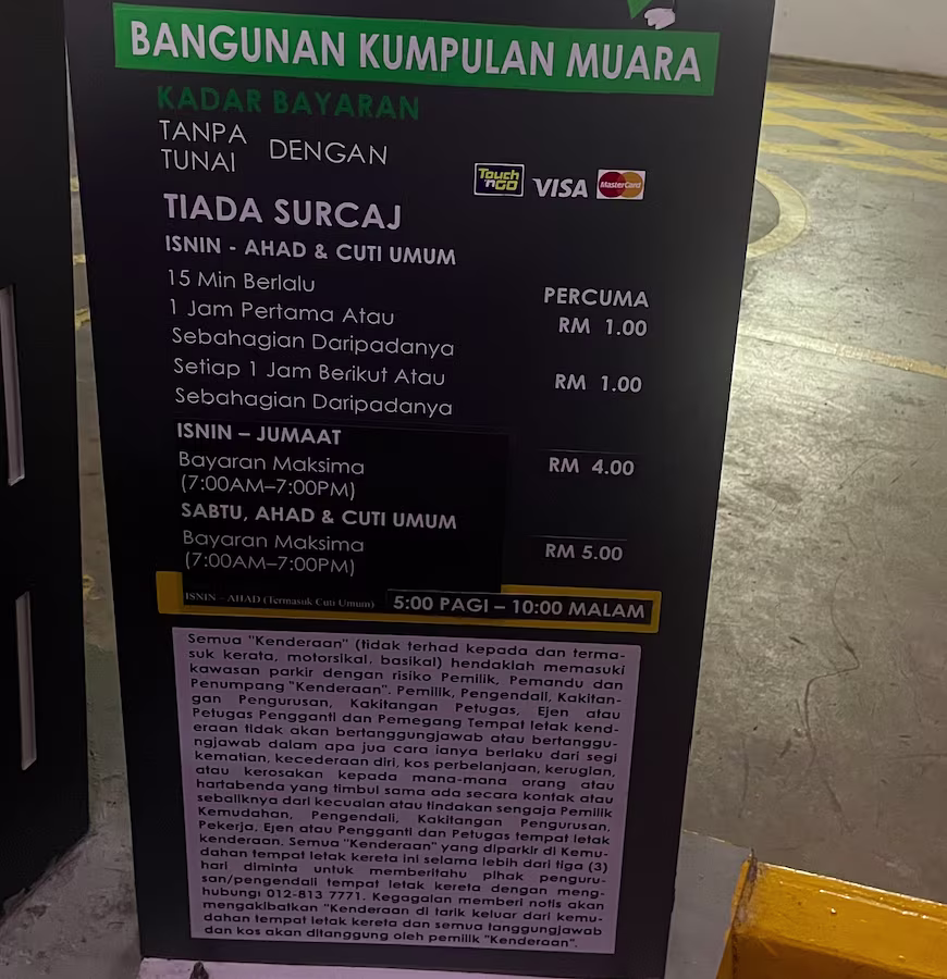 Bangunan Kumpulan Muara’s Parking Rate Board Share Copy URLWhatsAppFacebookTwitterLinkedinEmail Last Updated on October 11, 2025 by Parking Malaysia © parkinginmalaysia.com Back Share Copy URLWhatsAppFacebookTwitterLinkedinEmail Subscribe Notify of new follow-up comments new replies to my comments Label {} [+] Name* Email* Label {} [+] Name* Email* 0 Comments Oldest Newest Most Voted Inline Feedbacks View all comments Info Difference Between “Reserved” and “Non-Reserved” Monthly Pass Parking in Malaysia How much TnG balance is required for parking in Malaysia Can you use MyKad’s TnG for parking payments? Can You Use Your Bankcard To Exit Parking If Your T&G Card Has Insufficient Balance?