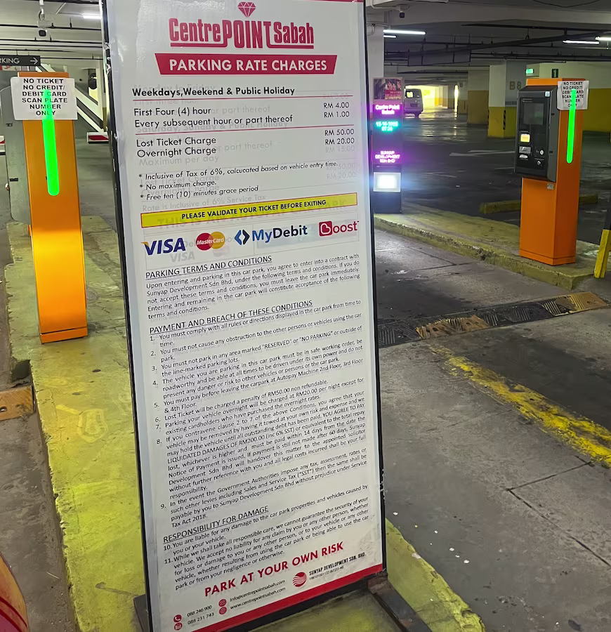 Centre Point Sabah’s Parking Rate Board Share Copy URLWhatsAppFacebookTwitterLinkedinEmail Last Updated on October 28, 2025 by Parking Malaysia © parkinginmalaysia.com Back Share Copy URLWhatsAppFacebookTwitterLinkedinEmail Subscribe Notify of new follow-up comments new replies to my comments Label {} [+] Name* Email* Label {} [+] Name* Email* 0 Comments Oldest Newest Most Voted Inline Feedbacks View all comments Info Difference Between “Reserved” and “Non-Reserved” Monthly Pass Parking in Malaysia How much TnG balance is required for parking in Malaysia Can you use MyKad’s TnG for parking payments? Can You Use Your Bankcard To Exit Parking If Your T&G Card Has Insufficient Balance?