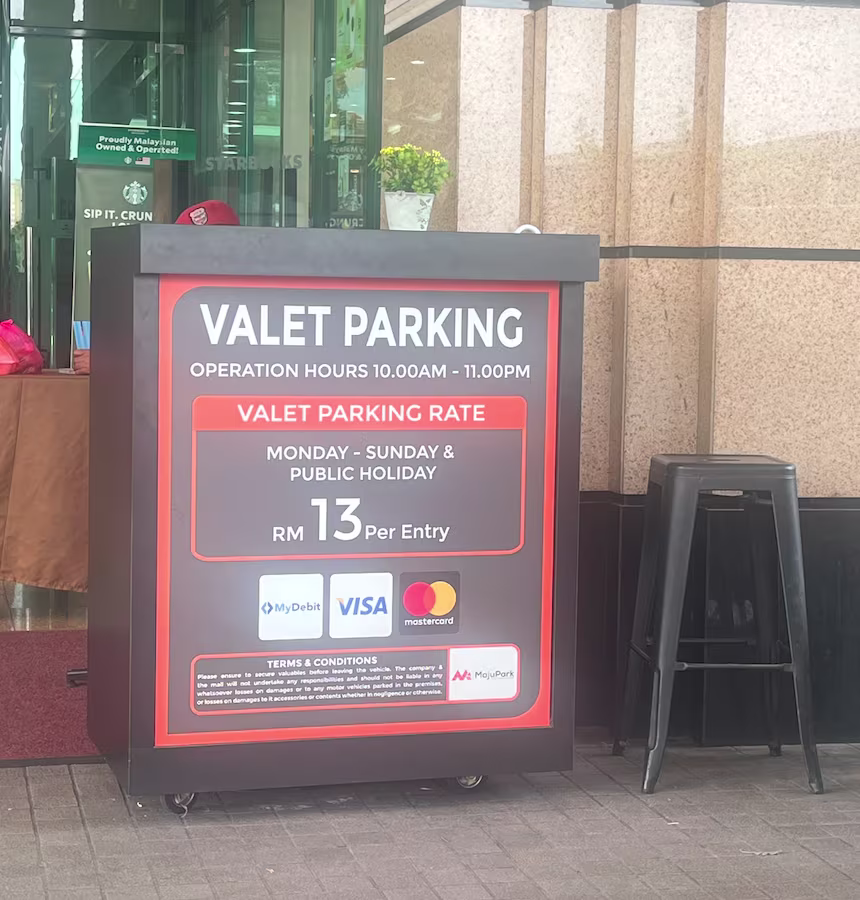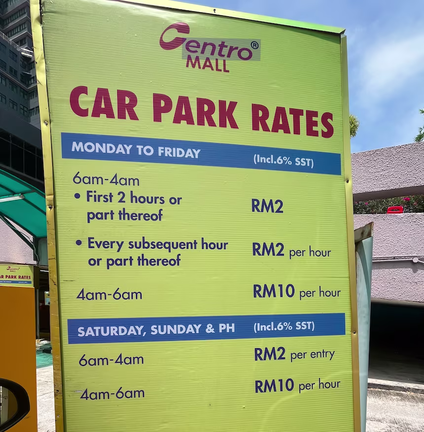 Centro Mall’s Parking Rate Boards Share Copy URLWhatsAppFacebookTwitterLinkedinEmail Last Updated on September 29, 2025 by Parking Malaysia Normal Parking © parkinginmalaysia.com Valet Parking © parkinginmalaysia.com Back Share Copy URLWhatsAppFacebookTwitterLinkedinEmail Subscribe Notify of new follow-up comments new replies to my comments Label {} [+] Name* Email* Label {} [+] Name* Email* 0 Comments Oldest Newest Most Voted Inline Feedbacks View all comments Info Difference Between “Reserved” and “Non-Reserved” Monthly Pass Parking in Malaysia How much TnG balance is required for parking in Malaysia Can you use MyKad’s TnG for parking payments? Can You Use Your Bankcard To Exit Parking If Your T&G Card Has Insufficient Balance?