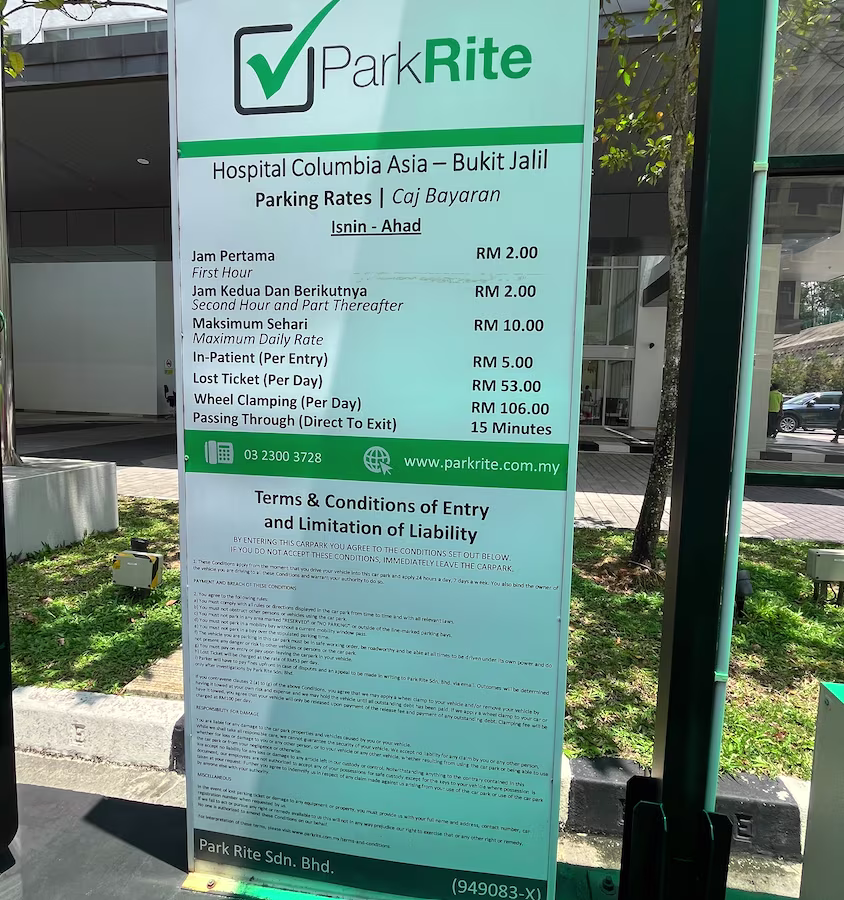 Columbia Asia Hospital – Bukit Jalil’s Parking Rate Board Share Copy URLWhatsAppFacebookTwitterLinkedinEmail Last Updated on October 18, 2025 by Parking Malaysia © parkinginmalaysia.com Back Share Copy URLWhatsAppFacebookTwitterLinkedinEmail Subscribe Notify of new follow-up comments new replies to my comments Label {} [+] Name* Email* Label {} [+] Name* Email* 0 Comments Oldest Newest Most Voted Inline Feedbacks View all comments Info Difference Between “Reserved” and “Non-Reserved” Monthly Pass Parking in Malaysia How much TnG balance is required for parking in Malaysia Can you use MyKad’s TnG for parking payments? Can You Use Your Bankcard To Exit Parking If Your T&G Card Has Insufficient Balance?