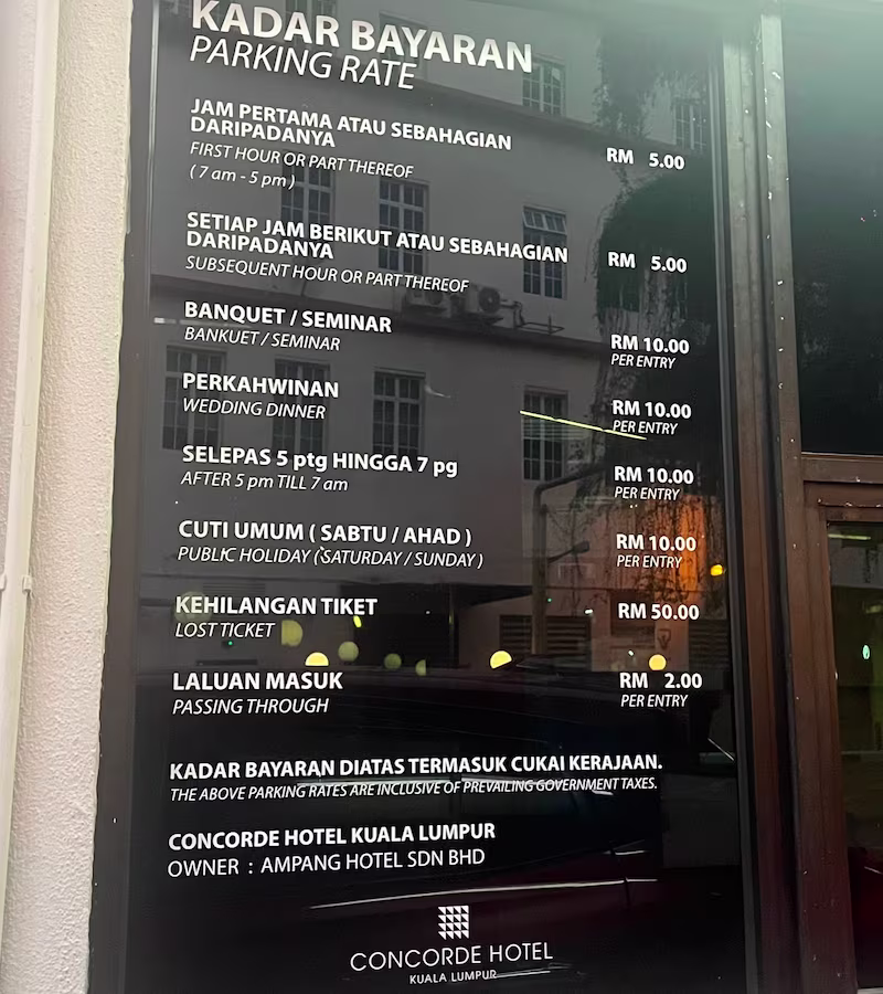 Concorde Hotel Kuala Lumpur Parking Rate Board