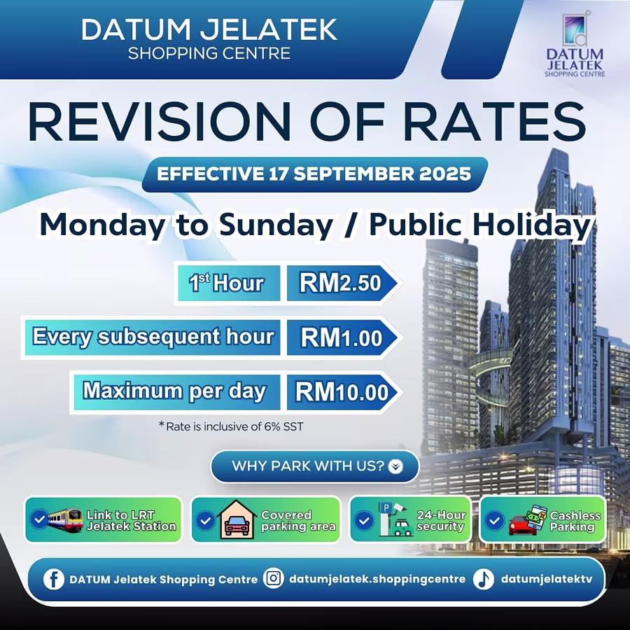 Datum Jelatek’s Parking Rate Notice Share Copy URLWhatsAppFacebookTwitterLinkedinEmail Last Updated on September 18, 2025 by Parking Malaysia Image source: fb.com/datumjelatekshoppingcentre Back Share Copy URLWhatsAppFacebookTwitterLinkedinEmail Subscribe Notify of new follow-up comments new replies to my comments Label {} [+] Name* Email* Label {} [+] Name* Email* 0 Comments Oldest Newest Most Voted Inline Feedbacks View all comments Info Difference Between “Reserved” and “Non-Reserved” Monthly Pass Parking in Malaysia How much TnG balance is required for parking in Malaysia Can you use MyKad’s TnG for parking payments? Can You Use Your Bankcard To Exit Parking If Your T&G Card Has Insufficient Balance?