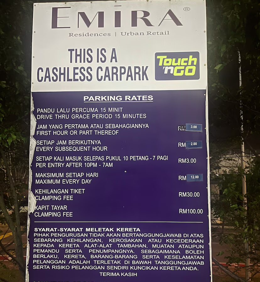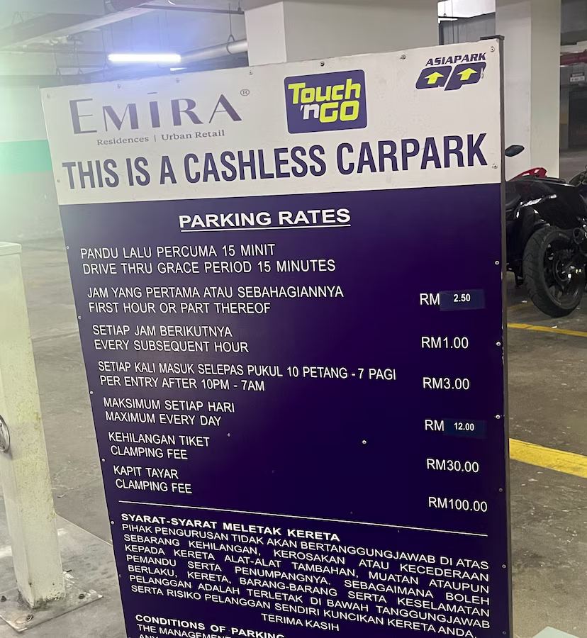 Emira Residence & Urban Retail’s Parking Rate Boards Share Copy URLWhatsAppFacebookTwitterLinkedinEmail Last Updated on October 20, 2025 by Parking Malaysia Outdoor | Podium © parkinginmalaysia.com Basement © parkinginmalaysia.com Back Share Copy URLWhatsAppFacebookTwitterLinkedinEmail Subscribe Notify of new follow-up comments new replies to my comments Label {} [+] Name* Email* Label {} [+] Name* Email* 0 Comments Oldest Newest Most Voted Inline Feedbacks View all comments Info Difference Between “Reserved” and “Non-Reserved” Monthly Pass Parking in Malaysia How much TnG balance is required for parking in Malaysia Can you use MyKad’s TnG for parking payments? Can You Use Your Bankcard To Exit Parking If Your T&G Card Has Insufficient Balance?