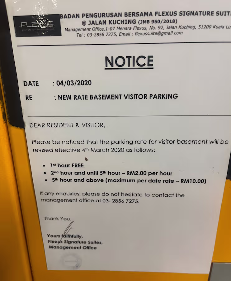 Flexus Signature Suites’ Parking Rate Notice Share Copy URLWhatsAppFacebookTwitterLinkedinEmail © parkinginmalaysia.com More Info Share Copy URLWhatsAppFacebookTwitterLinkedinEmail Subscribe Notify of new follow-up comments new replies to my comments Label {} [+] Name* Email* Label {} [+] Name* Email* 0 Comments Oldest Newest Most Voted Inline Feedbacks View all comments Info Difference Between “Reserved” and “Non-Reserved” Monthly Pass Parking in Malaysia How much TnG balance is required for parking in Malaysia Can you use MyKad’s TnG for parking payments? Can You Use Your Bankcard To Exit Parking If Your T&G Card Has Insufficient Balance?