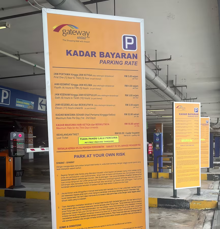 Gateway@KLIA2’s Parking Rate Board Share Copy URLWhatsAppFacebookTwitterLinkedinEmail Last Updated on September 14, 2025 by Parking Malaysia Normal Parking © parkinginmalaysia.com Valet Parking © parkinginmalaysia.com Back Share Copy URLWhatsAppFacebookTwitterLinkedinEmail Subscribe Notify of new follow-up comments new replies to my comments Label {} [+] Name* Email* Label {} [+] Name* Email* 0 Comments Oldest Newest Most Voted Inline Feedbacks View all comments Info Difference Between “Reserved” and “Non-Reserved” Monthly Pass Parking in Malaysia How much TnG balance is required for parking in Malaysia Can you use MyKad’s TnG for parking payments? Can You Use Your Bankcard To Exit Parking If Your T&G Card Has Insufficient Balance?