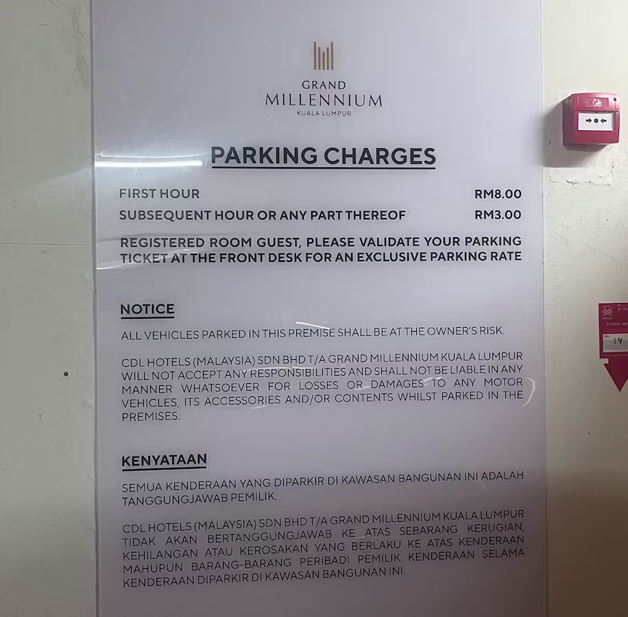 Grand Millennium Kuala Lumpur’s Parking Rate Board