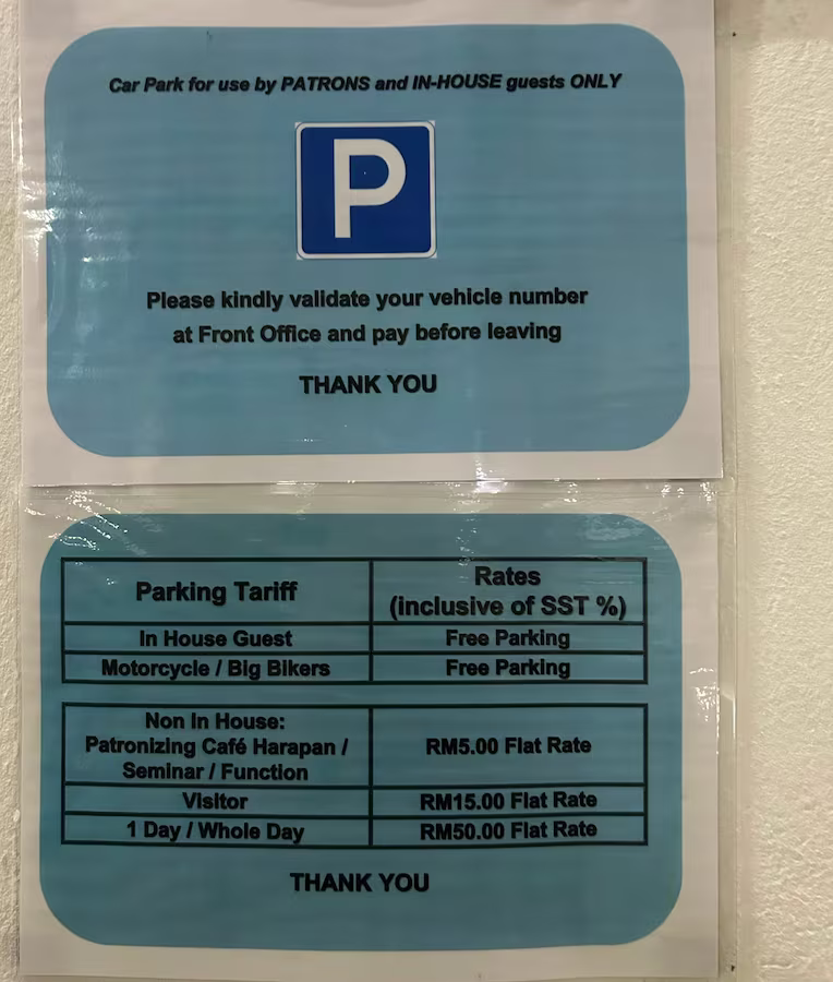 Harbour View Hotel’s Parking Rate Notice Share Copy URLWhatsAppFacebookTwitterLinkedinEmail Last Updated on September 21, 2025 by Parking Malaysia © parkinginmalaysia.com Back Share Copy URLWhatsAppFacebookTwitterLinkedinEmail Subscribe Notify of new follow-up comments new replies to my comments Label {} [+] Name* Email* Label {} [+] Name* Email* 0 Comments Oldest Newest Most Voted Inline Feedbacks View all comments Info Difference Between “Reserved” and “Non-Reserved” Monthly Pass Parking in Malaysia How much TnG balance is required for parking in Malaysia Can you use MyKad’s TnG for parking payments? Can You Use Your Bankcard To Exit Parking If Your T&G Card Has Insufficient Balance?