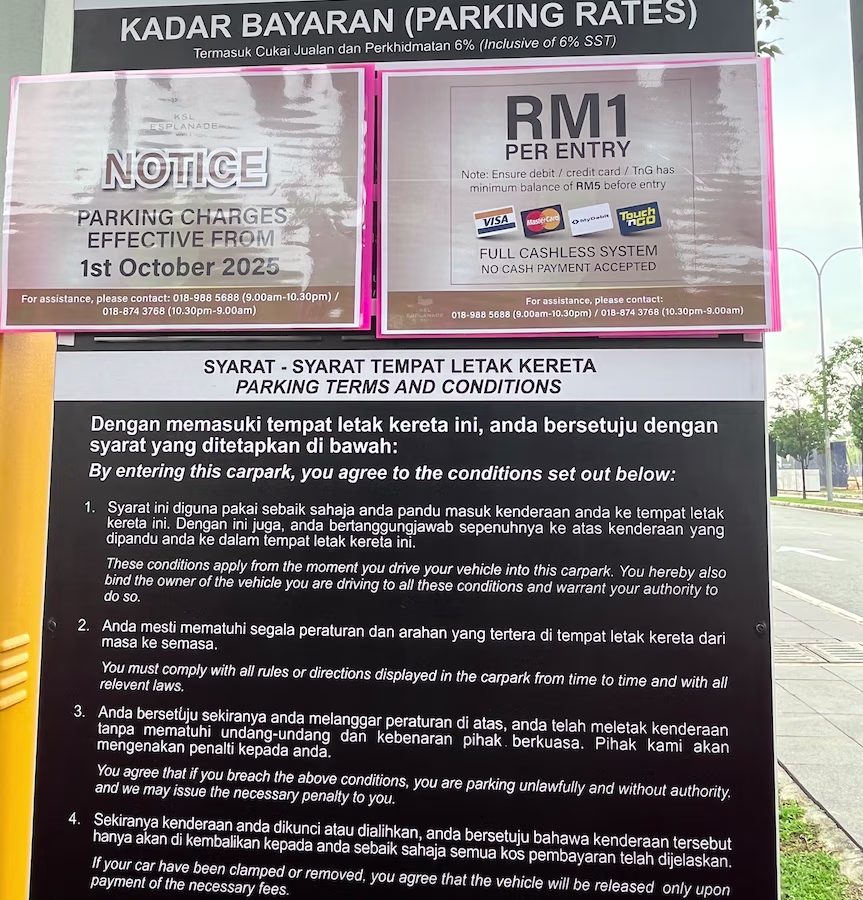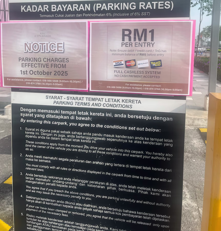 KSL Esplanade Mall’s Parking Rate Notice Share Copy URLWhatsAppFacebookTwitterLinkedinEmail Last Updated on October 7, 2025 by Parking Malaysia Outdoor © parkinginmalaysia.com Multi-Level © parkinginmalaysia.com Valet © parkinginmalaysia.com Back Share Copy URLWhatsAppFacebookTwitterLinkedinEmail Subscribe Notify of new follow-up comments new replies to my comments Label {} [+] Name* Email* Label {} [+] Name* Email* 0 Comments Oldest Newest Most Voted Inline Feedbacks View all comments Info Difference Between “Reserved” and “Non-Reserved” Monthly Pass Parking in Malaysia How much TnG balance is required for parking in Malaysia Can you use MyKad’s TnG for parking payments? Can You Use Your Bankcard To Exit Parking If Your T&G Card Has Insufficient Balance?