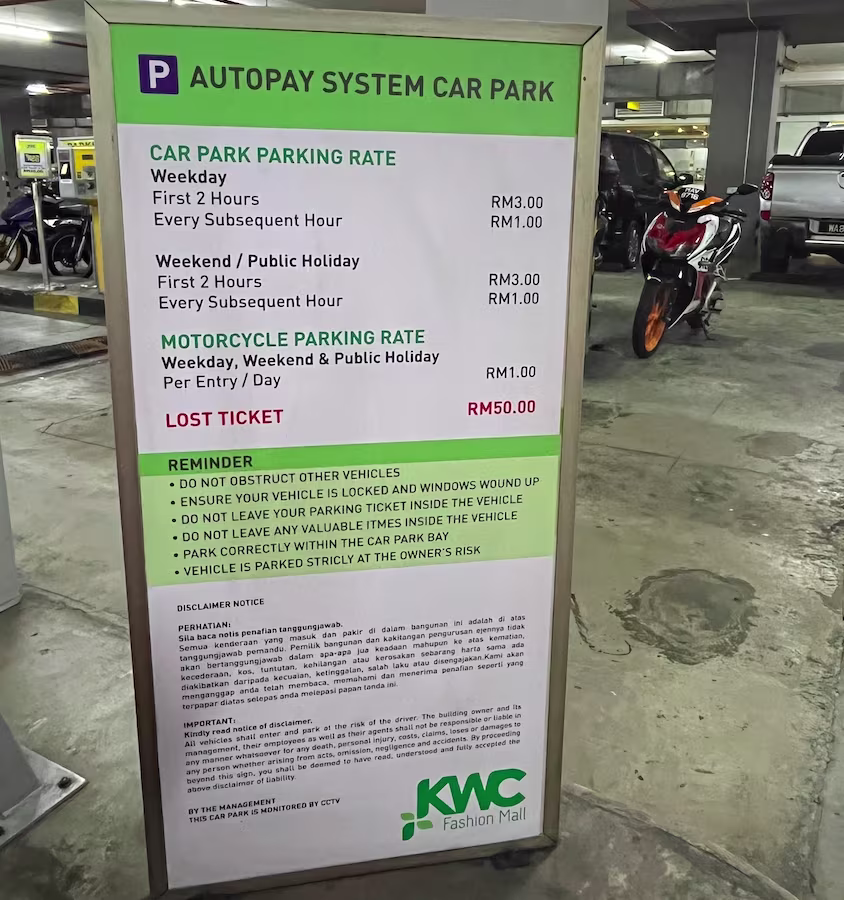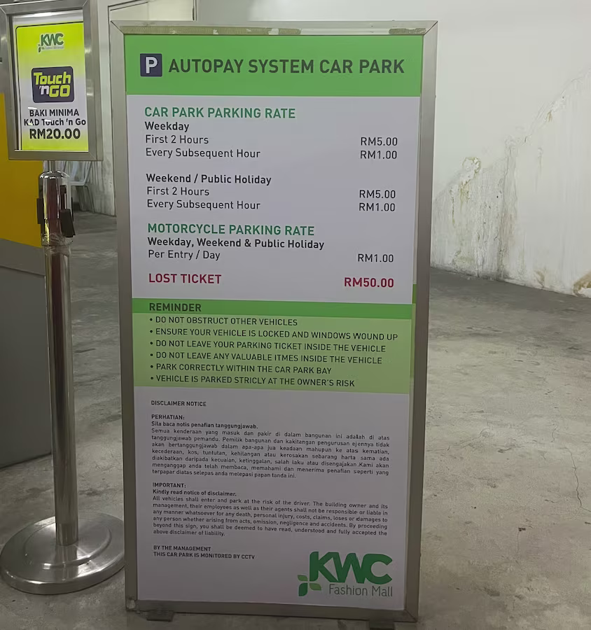 KWC Fashion Mall’s Parking Rate Boards Share Copy URLWhatsAppFacebookTwitterLinkedinEmail Last Updated on October 3, 2025 by Parking Malaysia Basement | Standard Vehicle © parkinginmalaysia.com Basement | Motorcycle © parkinginmalaysia.com Upper level | Standard Vehicle Only © parkinginmalaysia.com Back Share Copy URLWhatsAppFacebookTwitterLinkedinEmail Subscribe Notify of new follow-up comments new replies to my comments Label {} [+] Name* Email* Label {} [+] Name* Email* 0 Comments Oldest Newest Most Voted Inline Feedbacks View all comments Info Difference Between “Reserved” and “Non-Reserved” Monthly Pass Parking in Malaysia How much TnG balance is required for parking in Malaysia Can you use MyKad’s TnG for parking payments? Can You Use Your Bankcard To Exit Parking If Your T&G Card Has Insufficient Balance?