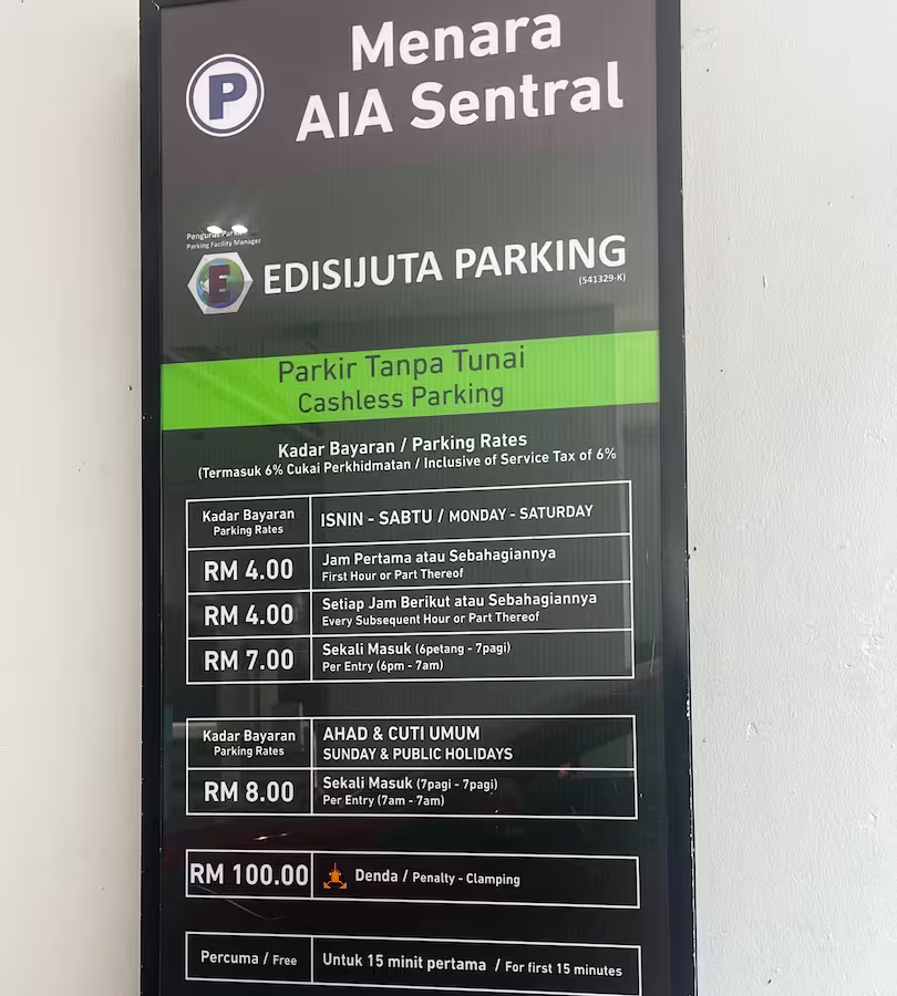Menara AIA Sentral’s Parking Rate Notice Share Copy URLWhatsAppFacebookTwitterLinkedinEmail © parkinginmalaysia.com Back Share Copy URLWhatsAppFacebookTwitterLinkedinEmail Subscribe Notify of new follow-up comments new replies to my comments Label {} [+] Name* Email* Label {} [+] Name* Email* 0 Comments Oldest Newest Most Voted Inline Feedbacks View all comments Info Difference Between “Reserved” and “Non-Reserved” Monthly Pass Parking in Malaysia How much TnG balance is required for parking in Malaysia Can you use MyKad’s TnG for parking payments? Can You Use Your Bankcard To Exit Parking If Your T&G Card Has Insufficient Balance?