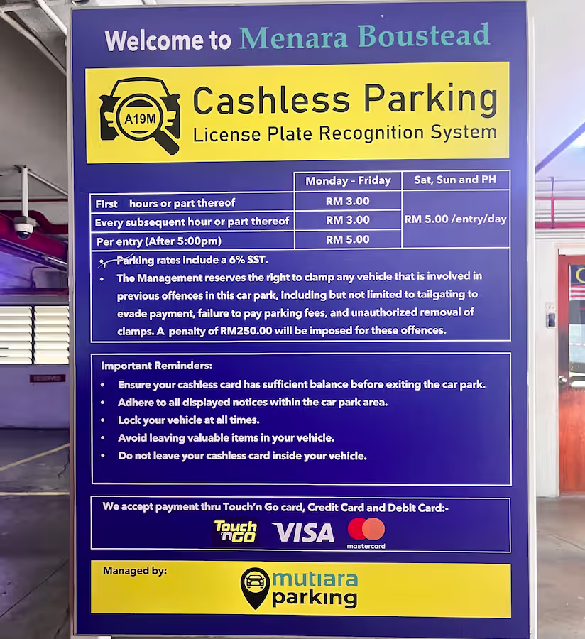 Menara Boustead’s Parking Rate Notice Share Copy URLWhatsAppFacebookXLinkedinEmail Last Updated On April 18, 2026 More Info Upload New Name *Email Address *Upload File(s) *Drag and Drop (or) Choose FilesSubmit Share Copy URLWhatsAppFacebookXLinkedinEmail Nearby car parks is only for members. Login if you already have an account or check out our membership plans for more info. Subscribe Notify of new follow-up comments new replies to my comments Label {} [+] Name* Email* Label {} [+] Name* Email* 0 Comments Oldest Newest Most Voted Inline Feedbacks View all comments Info Is 15 Minutes Grace Period Included in the First Hour of Parking? What Is Cut-Off Time in a Parking Rate Notice RM10.00 or RM20.00 Charged Instead of Normal Parking Rate? Can You Use Your Bankcard To Exit Parking If Your T&G Card Has Insufficient Balance? Can you use MyKad’s TnG for parking payments?