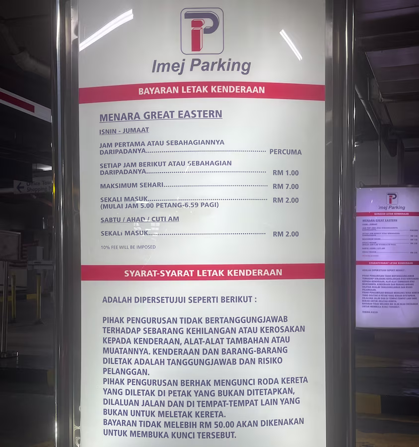 Menara Great Eastern / Great Eastern Mall’s Parking Rate Board Share Copy URLWhatsAppFacebookTwitterLinkedinEmail © parkinginmalaysia.com Back Share Copy URLWhatsAppFacebookTwitterLinkedinEmail Subscribe Notify of new follow-up comments new replies to my comments Label {} [+] Name* Email* Label {} [+] Name* Email* 0 Comments Oldest Newest Most Voted Inline Feedbacks View all comments Info Difference Between “Reserved” and “Non-Reserved” Monthly Pass Parking in Malaysia How much TnG balance is required for parking in Malaysia Can you use MyKad’s TnG for parking payments? Can You Use Your Bankcard To Exit Parking If Your T&G Card Has Insufficient Balance?