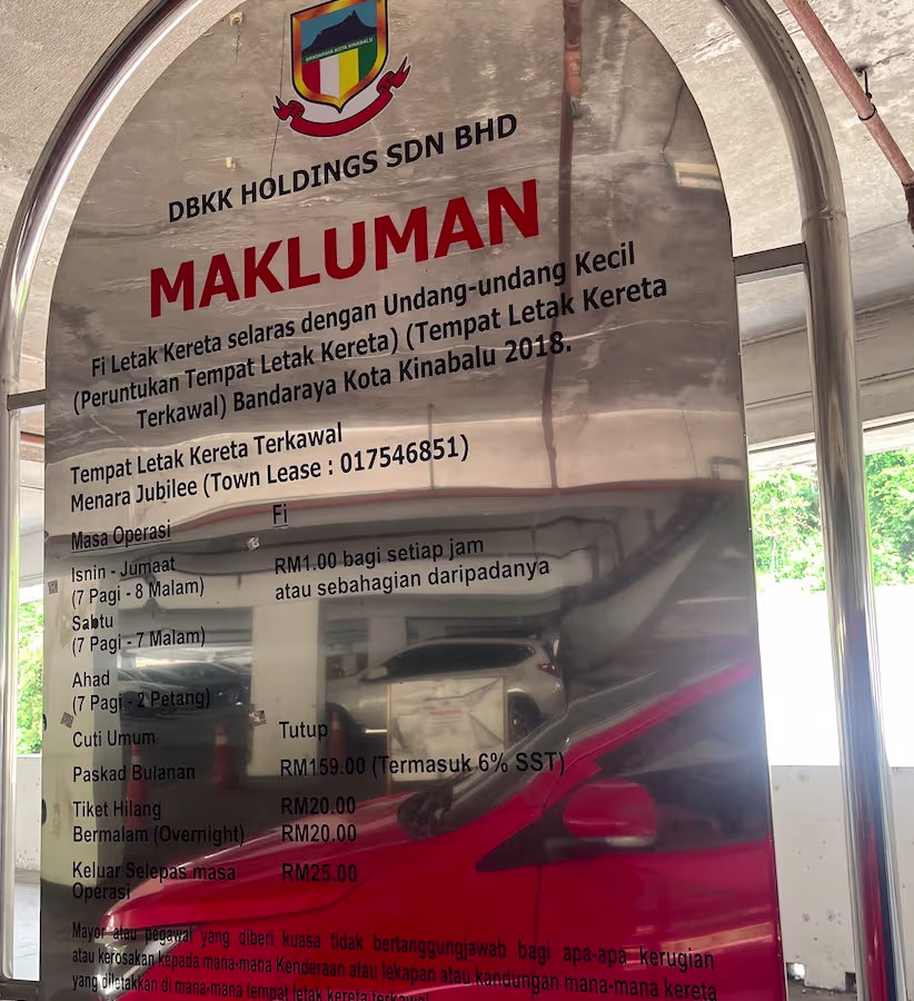 Menara Jubilee’s Parking Rate Notice Share Copy URLWhatsAppFacebookTwitterLinkedinEmail © parkinginmalaysia.coom Back Share Copy URLWhatsAppFacebookTwitterLinkedinEmail Subscribe Notify of new follow-up comments new replies to my comments Label {} [+] Name* Email* Label {} [+] Name* Email* 0 Comments Oldest Newest Most Voted Inline Feedbacks View all comments Info Difference Between “Reserved” and “Non-Reserved” Monthly Pass Parking in Malaysia How much TnG balance is required for parking in Malaysia Can you use MyKad’s TnG for parking payments? Can You Use Your Bankcard To Exit Parking If Your T&G Card Has Insufficient Balance?