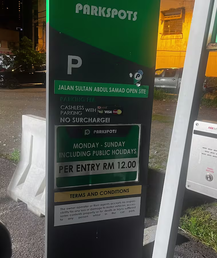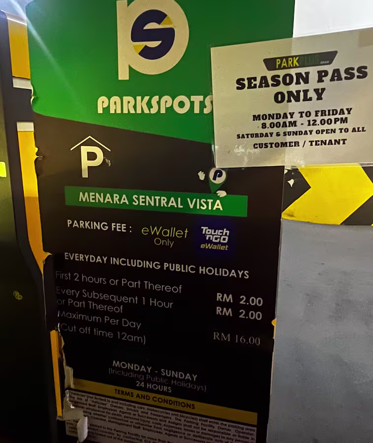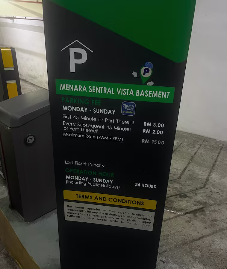 Menara Sentral Vista’s Parking Rate Notice Share Copy URLWhatsAppFacebookTwitterLinkedinEmail Multi-level © parkinginmalaysia.com Basement © parkinginmalaysia.com Outdoor © parkinginmalaysia.com More Info Share Copy URLWhatsAppFacebookTwitterLinkedinEmail Subscribe Notify of new follow-up comments new replies to my comments Label {} [+] Name* Email* Label {} [+] Name* Email* 0 Comments Oldest Newest Most Voted Inline Feedbacks View all comments Info Difference Between “Reserved” and “Non-Reserved” Monthly Pass Parking in Malaysia How much TnG balance is required for parking in Malaysia Can you use MyKad’s TnG for parking payments? Can You Use Your Bankcard To Exit Parking If Your T&G Card Has Insufficient Balance?