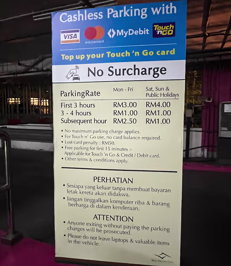 Mid Valley Megamall’s Parking Rate Board Share Copy URLWhatsAppFacebookTwitterLinkedinEmail Current Rate © parkinginmalaysia.com Previous Rate © parkinginmalaysia.com More Info Share Copy URLWhatsAppFacebookTwitterLinkedinEmail Subscribe Notify of new follow-up comments new replies to my comments Label {} [+] Name* Email* Label {} [+] Name* Email* 0 Comments Oldest Newest Most Voted Inline Feedbacks View all comments Info Difference Between “Reserved” and “Non-Reserved” Monthly Pass Parking in Malaysia How much TnG balance is required for parking in Malaysia Can you use MyKad’s TnG for parking payments? Can You Use Your Bankcard To Exit Parking If Your T&G Card Has Insufficient Balance?