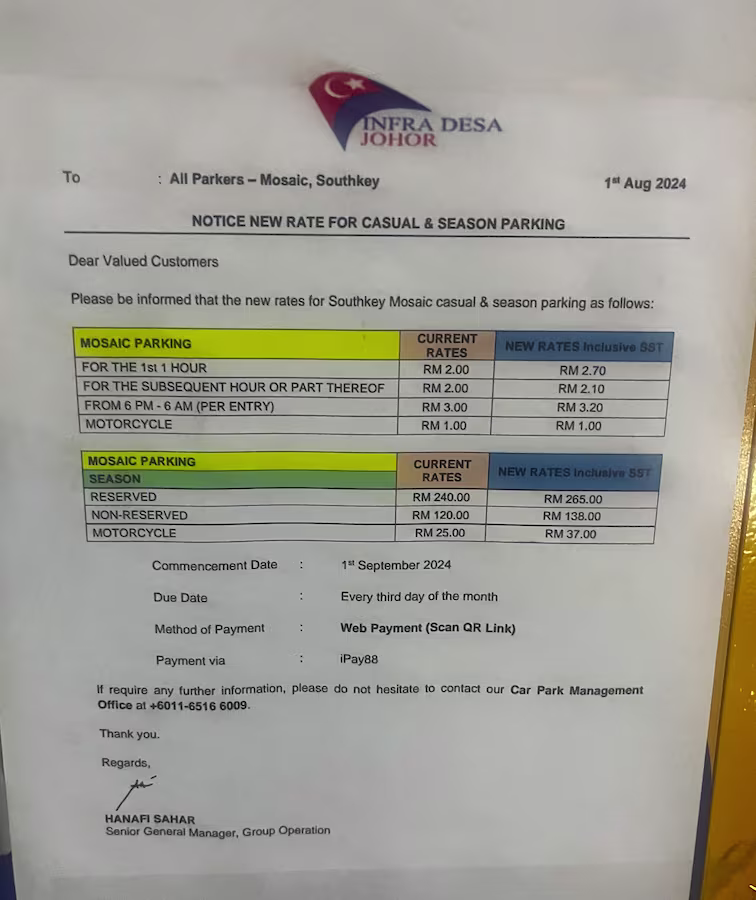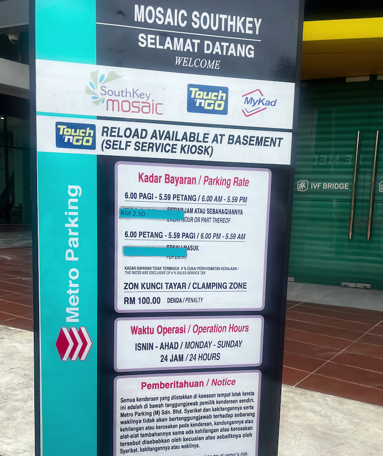 Mosaic Southkey’s Parking Rate Notice Share Copy URLWhatsAppFacebookTwitterLinkedinEmail Podium © parkinginmalaysia.com Basement © parkinginmalaysia.com More Info Share Copy URLWhatsAppFacebookTwitterLinkedinEmail Subscribe Notify of new follow-up comments new replies to my comments Label {} [+] Name* Email* Label {} [+] Name* Email* 0 Comments Oldest Newest Most Voted Inline Feedbacks View all comments Info Difference Between “Reserved” and “Non-Reserved” Monthly Pass Parking in Malaysia How much TnG balance is required for parking in Malaysia Can you use MyKad’s TnG for parking payments? Can You Use Your Bankcard To Exit Parking If Your T&G Card Has Insufficient Balance?