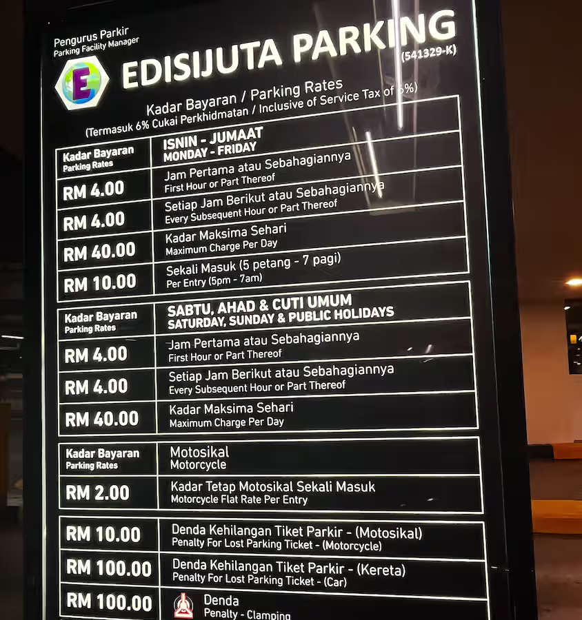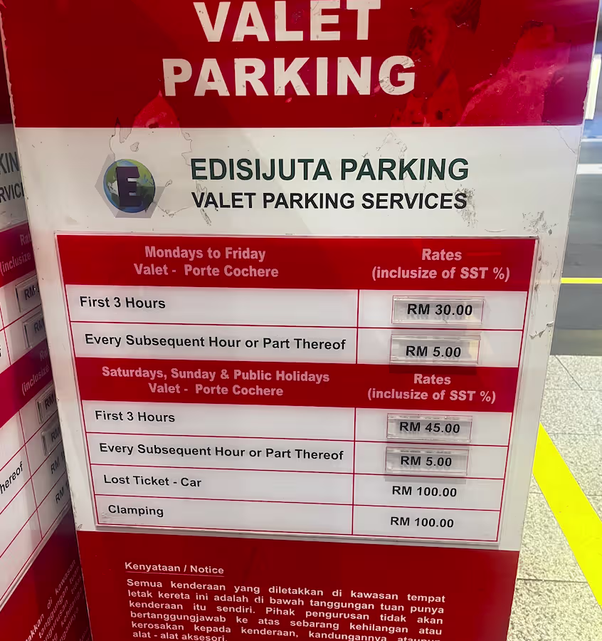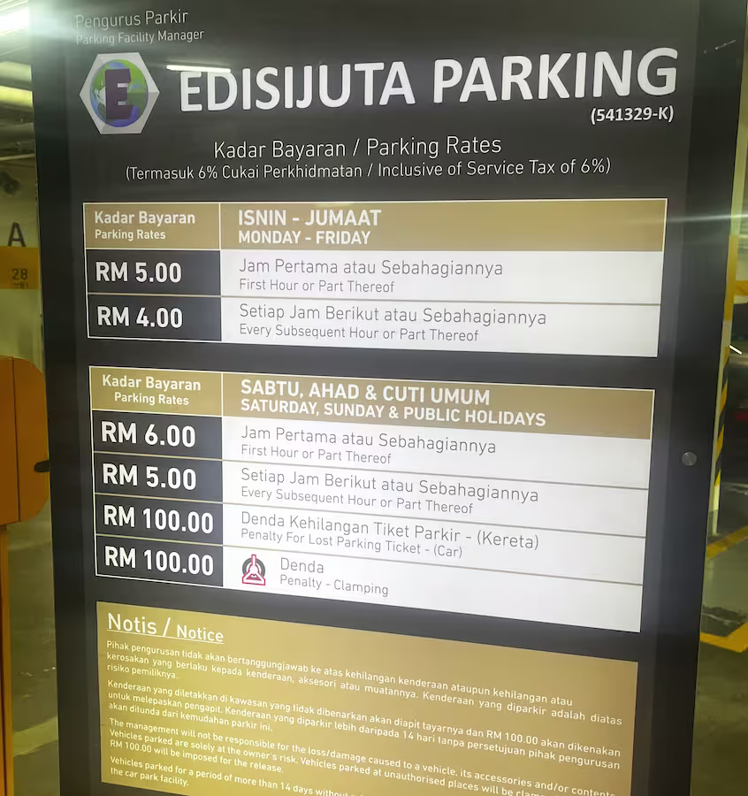 Pavilion Bukit Bintang’s Parking Rate Board Share Copy URLWhatsAppFacebookTwitterLinkedinEmail Basement © parkinginmalaysia.com Valet | Basement © parkinginmalaysia.com Valet | Porte Cochere © parkinginmalaysia.com Pavilion Hotel © parkinginmalaysia.com Back Share Copy URLWhatsAppFacebookTwitterLinkedinEmail Subscribe Notify of new follow-up comments new replies to my comments Label {} [+] Name* Email* Label {} [+] Name* Email* 0 Comments Oldest Newest Most Voted Inline Feedbacks View all comments Info Difference Between “Reserved” and “Non-Reserved” Monthly Pass Parking in Malaysia How much TnG balance is required for parking in Malaysia Can you use MyKad’s TnG for parking payments? Can You Use Your Bankcard To Exit Parking If Your T&G Card Has Insufficient Balance?