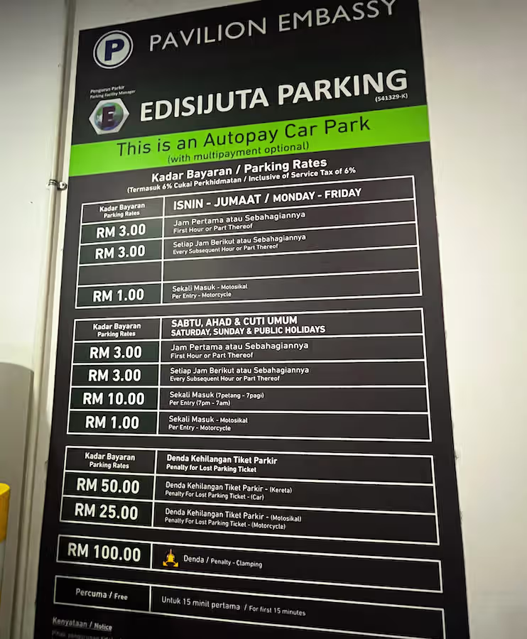 Pavilion Embassy’s Parking Rate Notice Share Copy URLWhatsAppFacebookTwitterLinkedinEmail © parkinginmalaysia.com Back Share Copy URLWhatsAppFacebookTwitterLinkedinEmail Subscribe Notify of new follow-up comments new replies to my comments Label {} [+] Name* Email* Label {} [+] Name* Email* 0 Comments Oldest Newest Most Voted Inline Feedbacks View all comments Info Difference Between “Reserved” and “Non-Reserved” Monthly Pass Parking in Malaysia How much TnG balance is required for parking in Malaysia Can you use MyKad’s TnG for parking payments? Can You Use Your Bankcard To Exit Parking If Your T&G Card Has Insufficient Balance?