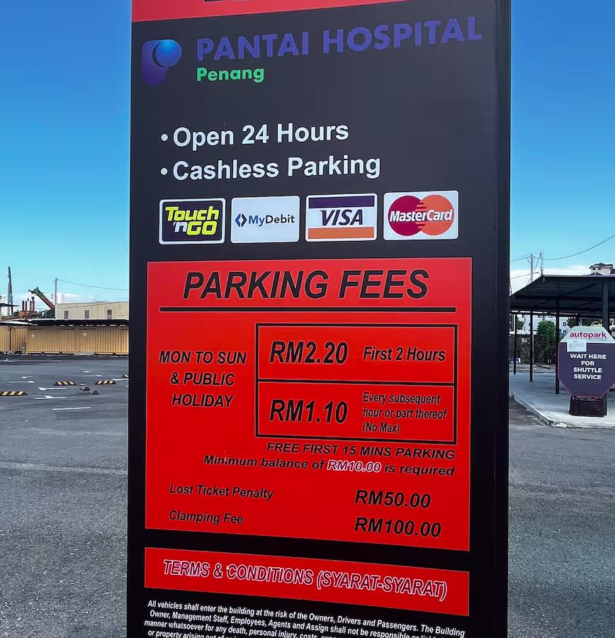 Penang Pantai Hospital’s Parking Rate Board Share Copy URLWhatsAppFacebookTwitterLinkedinEmail Last Updated On February 19, 2026 Outdoor Indoor & Multi-Level Valet Previous Rates More Info Nearby Car Parks is only available for our subscribers. More Info Share Copy URLWhatsAppFacebookTwitterLinkedinEmail Subscribe Notify of new follow-up comments new replies to my comments Label {} [+] Name* Email* Label {} [+] Name* Email* 0 Comments Oldest Newest Most Voted Inline Feedbacks View all comments Info Is 15 Minutes Grace Period Included in the First Hour of Parking? What Is Cut-Off Time in a Parking Rate Notice RM10.00 or RM20.00 Charged Instead of Normal Parking Rate? Can You Use Your Bankcard To Exit Parking If Your T&G Card Has Insufficient Balance? Can you use MyKad’s TnG for parking payments?