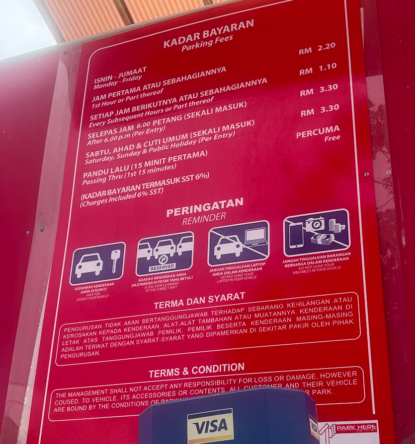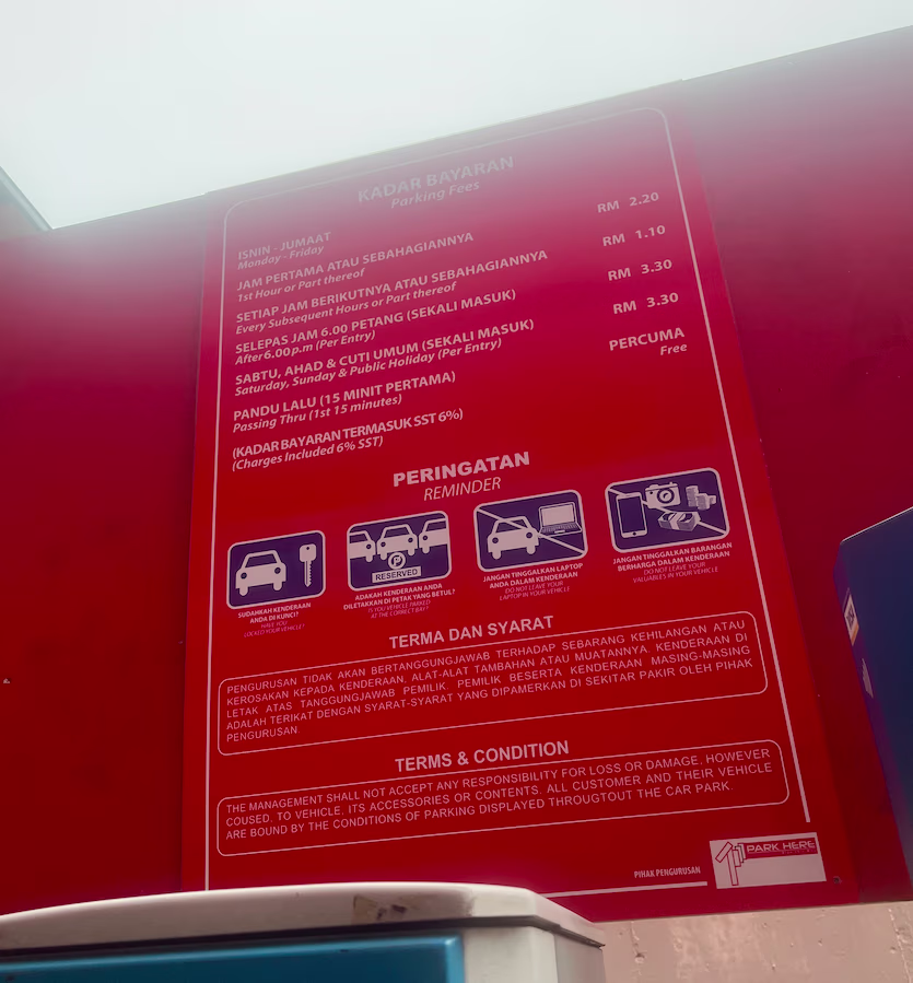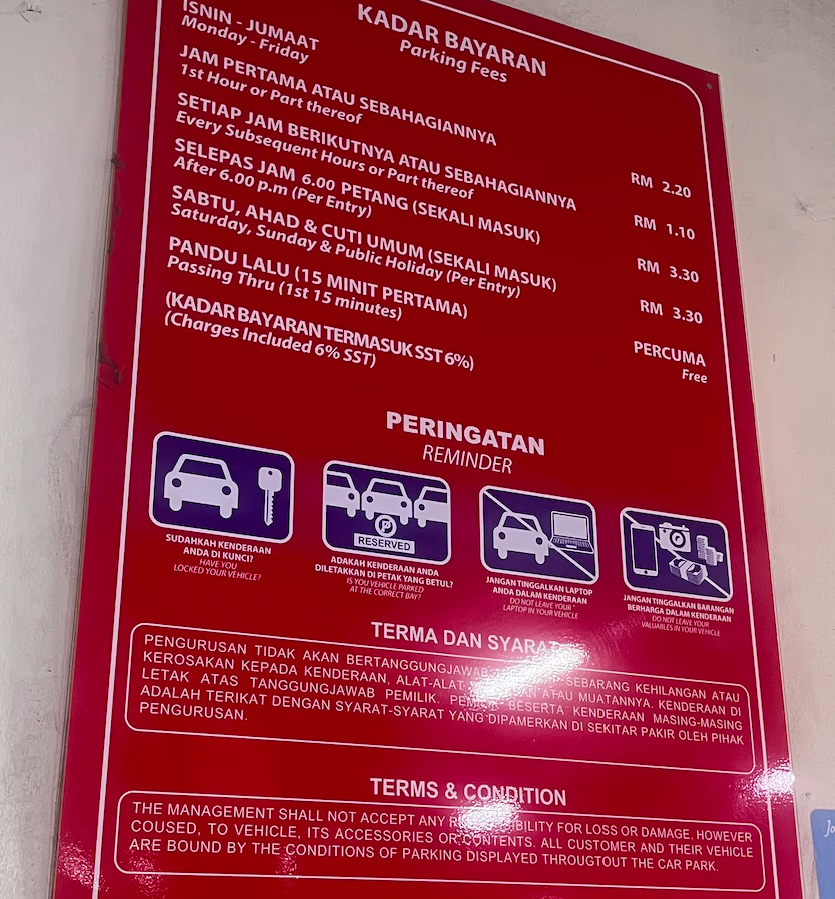 SACC Mall’s Parking Rate Boards Share Copy URLWhatsAppFacebookTwitterLinkedinEmail Last Updated on October 11, 2025 by Parking Malaysia Outdoor © parkinginmalaysia.com Basement © parkinginmalaysia.com Multi-Level © parkinginmalaysia.com Back Share Copy URLWhatsAppFacebookTwitterLinkedinEmail Subscribe Notify of new follow-up comments new replies to my comments Label {} [+] Name* Email* Label {} [+] Name* Email* 0 Comments Oldest Newest Most Voted Inline Feedbacks View all comments Info Difference Between “Reserved” and “Non-Reserved” Monthly Pass Parking in Malaysia How much TnG balance is required for parking in Malaysia Can you use MyKad’s TnG for parking payments? Can You Use Your Bankcard To Exit Parking If Your T&G Card Has Insufficient Balance?