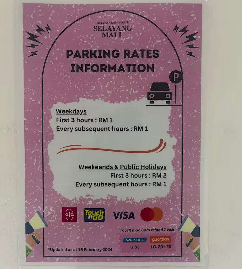 Selayang Mall’s Parking Rate Notice Share Copy URLWhatsAppFacebookTwitterLinkedinEmail Last Updated on October 30, 2025 by Parking Malaysia © parkinginmalaysia.com Back Share Copy URLWhatsAppFacebookTwitterLinkedinEmail Subscribe Notify of new follow-up comments new replies to my comments Label {} [+] Name* Email* Label {} [+] Name* Email* 0 Comments Oldest Newest Most Voted Inline Feedbacks View all comments Info Difference Between “Reserved” and “Non-Reserved” Monthly Pass Parking in Malaysia How much TnG balance is required for parking in Malaysia Can you use MyKad’s TnG for parking payments? Can You Use Your Bankcard To Exit Parking If Your T&G Card Has Insufficient Balance?