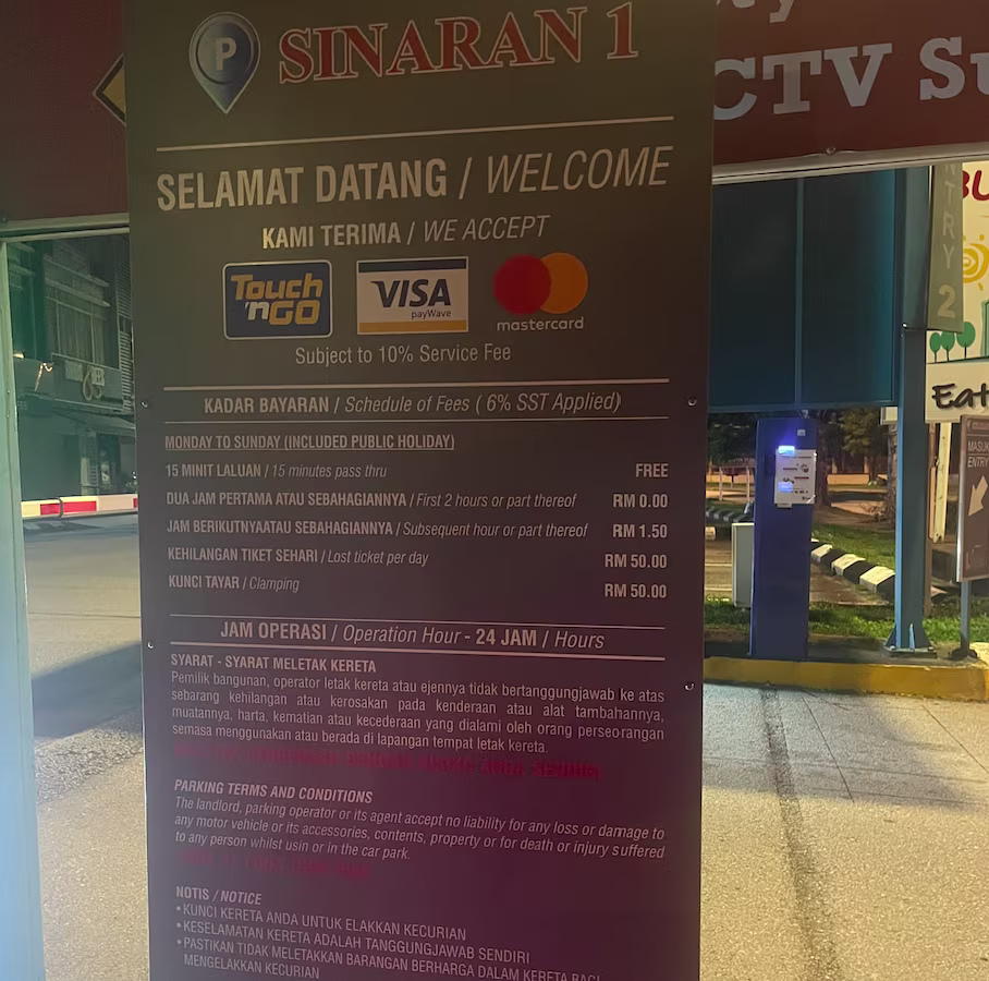 Sinaran 1’s Parking Rate Board Share Copy URLWhatsAppFacebookTwitterLinkedinEmail Last Updated on October 7, 2025 by Parking Malaysia © parkinginmalaysia.com Back Share Copy URLWhatsAppFacebookTwitterLinkedinEmail Subscribe Notify of new follow-up comments new replies to my comments Label {} [+] Name* Email* Label {} [+] Name* Email* 0 Comments Oldest Newest Most Voted Inline Feedbacks View all comments Info Difference Between “Reserved” and “Non-Reserved” Monthly Pass Parking in Malaysia How much TnG balance is required for parking in Malaysia Can you use MyKad’s TnG for parking payments? Can You Use Your Bankcard To Exit Parking If Your T&G Card Has Insufficient Balance?