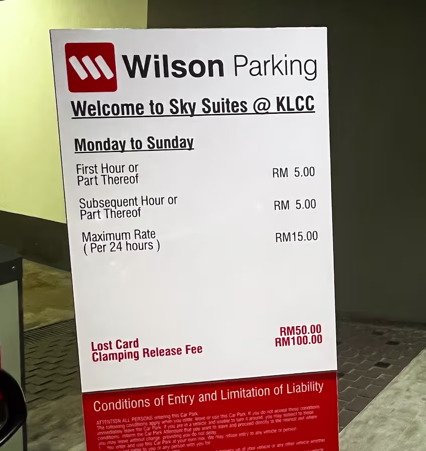 Sky Suites @ KLCC’s Parking Rate Notice Share Copy URLWhatsAppFacebookTwitterLinkedinEmail © parkinginmalaysia.com Back Share Copy URLWhatsAppFacebookTwitterLinkedinEmail Subscribe Notify of new follow-up comments new replies to my comments Label {} [+] Name* Email* Label {} [+] Name* Email* 0 Comments Oldest Newest Most Voted Inline Feedbacks View all comments Info Difference Between “Reserved” and “Non-Reserved” Monthly Pass Parking in Malaysia How much TnG balance is required for parking in Malaysia Can you use MyKad’s TnG for parking payments? Can You Use Your Bankcard To Exit Parking If Your T&G Card Has Insufficient Balance?