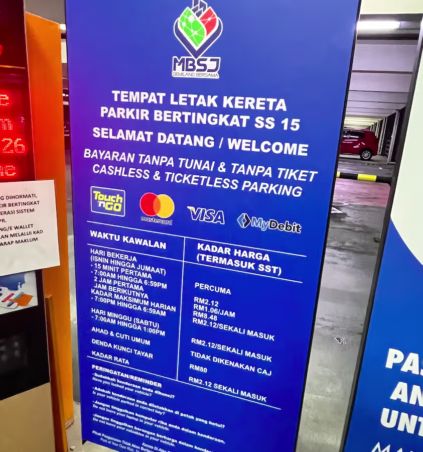 SS15 MBSJ Multi-level Car Park’s Parking Rate Notice Share Copy URLWhatsAppFacebookXLinkedinEmail Last Updated On April 9, 2026 More Info Upload New Name *Email Address *Upload File(s) *Drag and Drop (or) Choose FilesSubmit Share Copy URLWhatsAppFacebookXLinkedinEmail Nearby car parks is only for subscribers. More info here Subscribe Notify of new follow-up comments new replies to my comments Label {} [+] Name* Email* Label {} [+] Name* Email* 0 Comments Oldest Newest Most Voted Inline Feedbacks View all comments Info Is 15 Minutes Grace Period Included in the First Hour of Parking? What Is Cut-Off Time in a Parking Rate Notice RM10.00 or RM20.00 Charged Instead of Normal Parking Rate? Can You Use Your Bankcard To Exit Parking If Your T&G Card Has Insufficient Balance? Can you use MyKad’s TnG for parking payments?