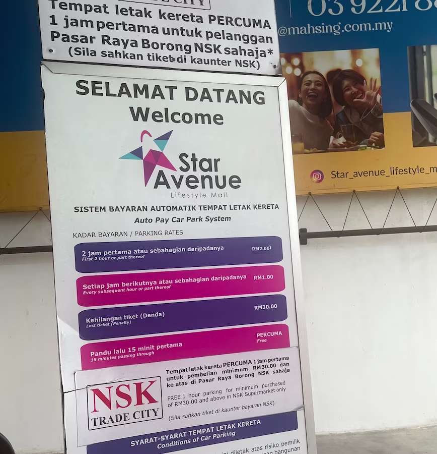 Star Avenue Lifestyle Mall’s Parking Rate Boards Share Copy URLWhatsAppFacebookTwitterLinkedinEmail Last Updated on October 5, 2025 by Parking Malaysia Basement © parkinginmalaysia.com Multi-Level © parkinginmalaysia.com Back Share Copy URLWhatsAppFacebookTwitterLinkedinEmail Subscribe Notify of new follow-up comments new replies to my comments Label {} [+] Name* Email* Label {} [+] Name* Email* 0 Comments Oldest Newest Most Voted Inline Feedbacks View all comments Info Difference Between “Reserved” and “Non-Reserved” Monthly Pass Parking in Malaysia How much TnG balance is required for parking in Malaysia Can you use MyKad’s TnG for parking payments? Can You Use Your Bankcard To Exit Parking If Your T&G Card Has Insufficient Balance?