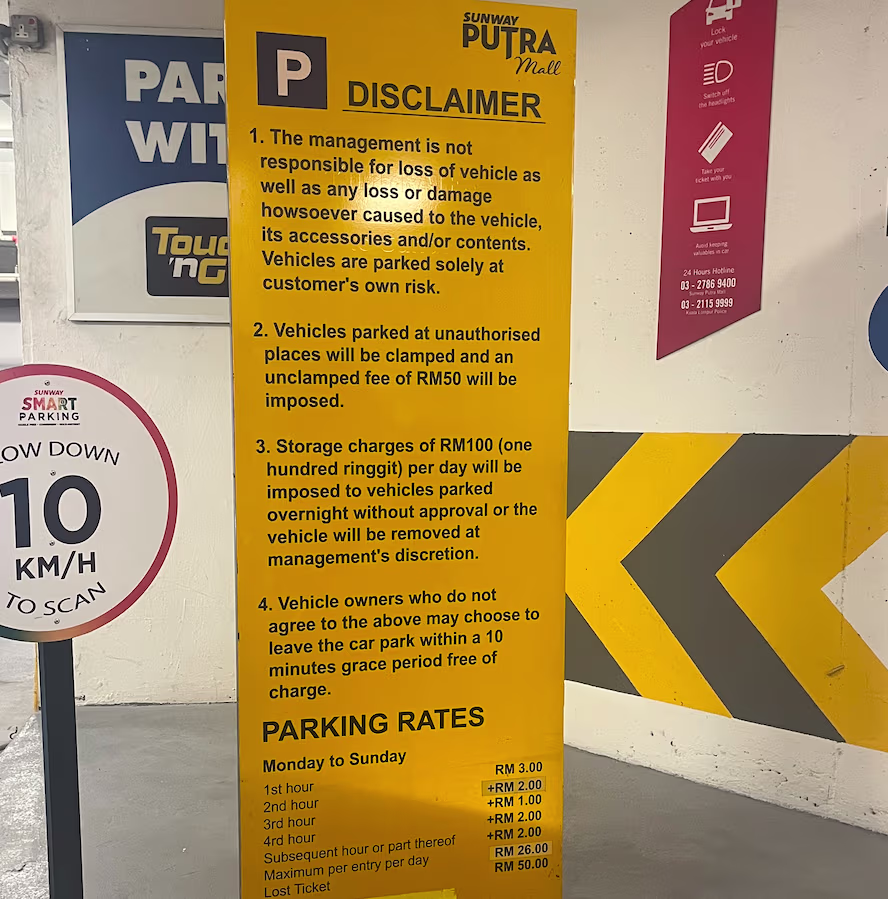 Sunway Putra Mall’s Parking Rate Board Share Copy URLWhatsAppFacebookTwitterLinkedinEmail Last Updated on October 5, 2025 by Parking Malaysia Basement & Multi-Level © parkinginmalaysia.com Valet © parkinginmalaysia.com Back Share Copy URLWhatsAppFacebookTwitterLinkedinEmail Subscribe Notify of new follow-up comments new replies to my comments Label {} [+] Name* Email* Label {} [+] Name* Email* 0 Comments Oldest Newest Most Voted Inline Feedbacks View all comments Info Difference Between “Reserved” and “Non-Reserved” Monthly Pass Parking in Malaysia How much TnG balance is required for parking in Malaysia Can you use MyKad’s TnG for parking payments? Can You Use Your Bankcard To Exit Parking If Your T&G Card Has Insufficient Balance?