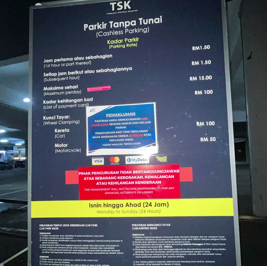 Terminal Sentral Kuantan’s Parking Rate Board Share Copy URLWhatsAppFacebookTwitterLinkedinEmail Last Updated on August 31, 2025 by Parking Malaysia © parkinginmalaysia.com Back Share Copy URLWhatsAppFacebookTwitterLinkedinEmail Subscribe Notify of new follow-up comments new replies to my comments Label {} [+] Name* Email* Label {} [+] Name* Email* 0 Comments Oldest Newest Most Voted Inline Feedbacks View all comments Info Difference Between “Reserved” and “Non-Reserved” Monthly Pass Parking in Malaysia How much TnG balance is required for parking in Malaysia Can you use MyKad’s TnG for parking payments? Can You Use Your Bankcard To Exit Parking If Your T&G Card Has Insufficient Balance?