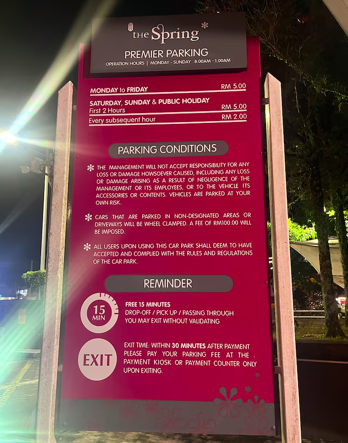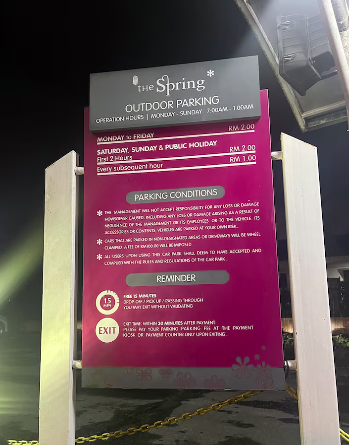 The Spring Kuching’s Parking Rate Boards Share Copy URLWhatsAppFacebookTwitterLinkedinEmail Last Updated on September 15, 2025 by Parking Malaysia Outdoor © parkinginmalaysia.com Basement © parkinginmalaysia.com Premier © parkinginmalaysia.com Back Share Copy URLWhatsAppFacebookTwitterLinkedinEmail Subscribe Notify of new follow-up comments new replies to my comments Label {} [+] Name* Email* Label {} [+] Name* Email* 0 Comments Oldest Newest Most Voted Inline Feedbacks View all comments Info Difference Between “Reserved” and “Non-Reserved” Monthly Pass Parking in Malaysia How much TnG balance is required for parking in Malaysia Can you use MyKad’s TnG for parking payments? Can You Use Your Bankcard To Exit Parking If Your T&G Card Has Insufficient Balance?