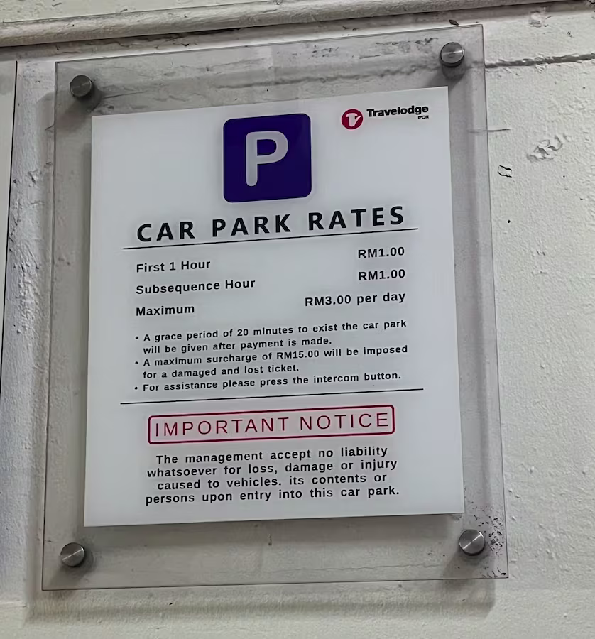 Travelodge Ipoh’s Parking Rate Notice Share Copy URLWhatsAppFacebookTwitterLinkedinEmail Last Updated on October 10, 2025 by Parking Malaysia © parkinginmalaysia.com Back Share Copy URLWhatsAppFacebookTwitterLinkedinEmail Subscribe Notify of new follow-up comments new replies to my comments Label {} [+] Name* Email* Label {} [+] Name* Email* 0 Comments Oldest Newest Most Voted Inline Feedbacks View all comments Info Difference Between “Reserved” and “Non-Reserved” Monthly Pass Parking in Malaysia How much TnG balance is required for parking in Malaysia Can you use MyKad’s TnG for parking payments? Can You Use Your Bankcard To Exit Parking If Your T&G Card Has Insufficient Balance?
