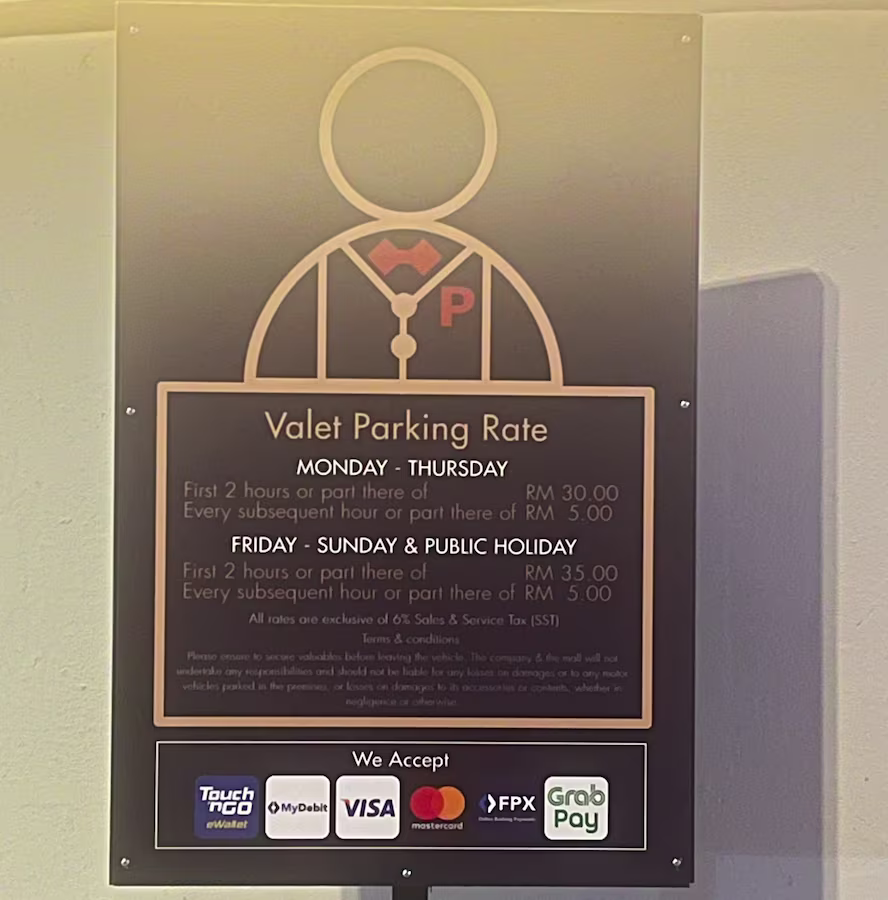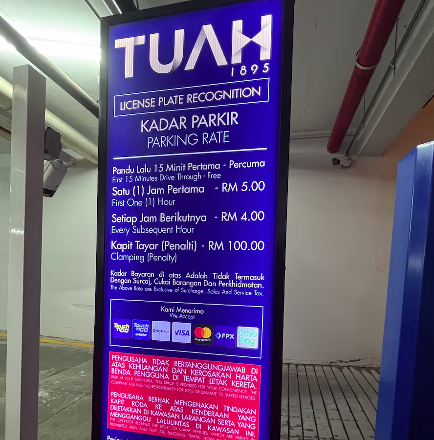 Tuah 1895’s Parking Rate Boards Share Copy URLWhatsAppFacebookTwitterLinkedinEmail Last Updated on October 8, 2025 by Parking Malaysia Basement © parkinginmalaysia.com Valet © parkinginmalaysia.com Back Share Copy URLWhatsAppFacebookTwitterLinkedinEmail Subscribe Notify of new follow-up comments new replies to my comments Label {} [+] Name* Email* Label {} [+] Name* Email* 0 Comments Oldest Newest Most Voted Inline Feedbacks View all comments Info Difference Between “Reserved” and “Non-Reserved” Monthly Pass Parking in Malaysia How much TnG balance is required for parking in Malaysia Can you use MyKad’s TnG for parking payments? Can You Use Your Bankcard To Exit Parking If Your T&G Card Has Insufficient Balance?