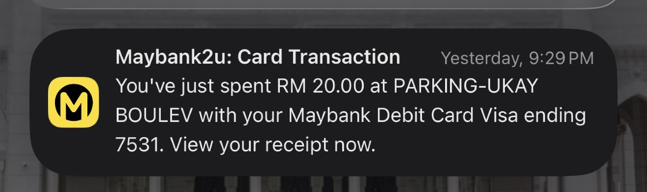 Parking rm 3 diduct rm 20 spent for 2 hours