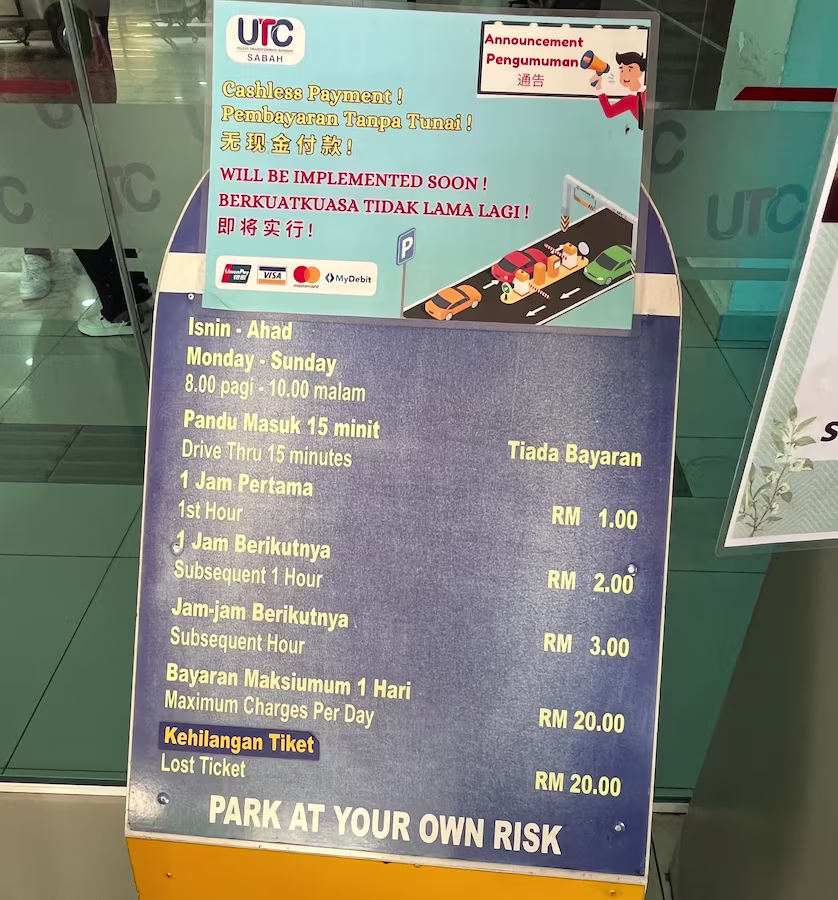 UTC Sabah’s Parking Rate Notice Share Copy URLWhatsAppFacebookTwitterLinkedinEmail Last Updated on October 19, 2025 by Parking Malaysia © parkinginmalaysia.com Back Share Copy URLWhatsAppFacebookTwitterLinkedinEmail Subscribe Notify of new follow-up comments new replies to my comments Label {} [+] Name* Email* Label {} [+] Name* Email* 0 Comments Oldest Newest Most Voted Inline Feedbacks View all comments Info Difference Between “Reserved” and “Non-Reserved” Monthly Pass Parking in Malaysia How much TnG balance is required for parking in Malaysia Can you use MyKad’s TnG for parking payments? Can You Use Your Bankcard To Exit Parking If Your T&G Card Has Insufficient Balance?