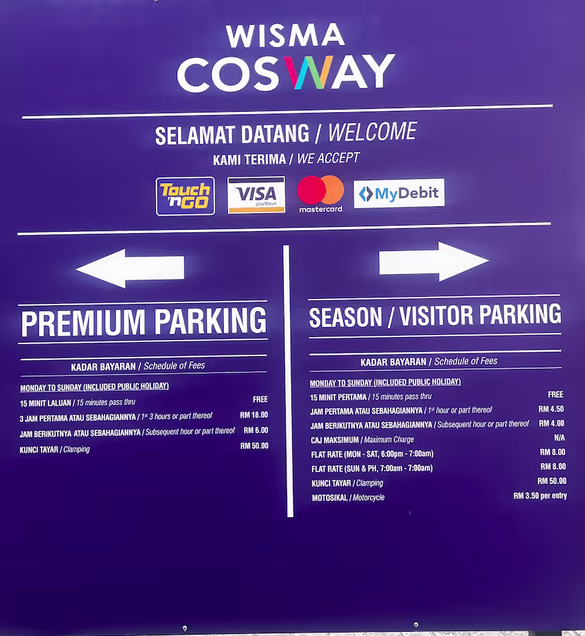 Wisma Cosway’s Parking Rate Notice Share Copy URLWhatsAppFacebookTwitterLinkedinEmail © parkinginmalaysia.com Back Share Copy URLWhatsAppFacebookTwitterLinkedinEmail Subscribe Notify of new follow-up comments new replies to my comments Label {} [+] Name* Email* Label {} [+] Name* Email* 0 Comments Oldest Newest Most Voted Inline Feedbacks View all comments Info Difference Between “Reserved” and “Non-Reserved” Monthly Pass Parking in Malaysia How much TnG balance is required for parking in Malaysia Can you use MyKad’s TnG for parking payments? Can You Use Your Bankcard To Exit Parking If Your T&G Card Has Insufficient Balance?