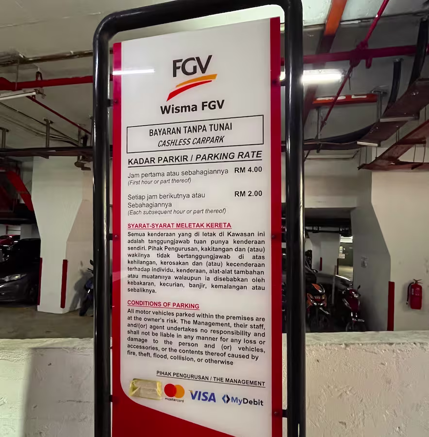 Wisma FGV’s Parking Rate Notice Share Copy URLWhatsAppFacebookXLinkedinEmail Last Updated On March 23, 2026 More Info Upload New Name *Email Address *Upload File(s) *Drag and Drop (or) Choose FilesSubmit Share Copy URLWhatsAppFacebookXLinkedinEmail Nearby car parks is only for subscribers. More info here Subscribe Notify of new follow-up comments new replies to my comments Label {} [+] Name* Email* Label {} [+] Name* Email* 0 Comments Oldest Newest Most Voted Inline Feedbacks View all comments Info Is 15 Minutes Grace Period Included in the First Hour of Parking? What Is Cut-Off Time in a Parking Rate Notice RM10.00 or RM20.00 Charged Instead of Normal Parking Rate? Can You Use Your Bankcard To Exit Parking If Your T&G Card Has Insufficient Balance? Can you use MyKad’s TnG for parking payments?