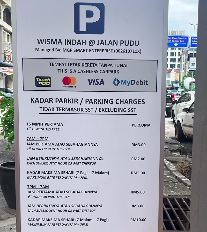 Wisma Indah Jalan Pudu’s Parking Rate Board Share Copy URLWhatsAppFacebookTwitterLinkedinEmail Last Updated on October 22, 2025 by Parking Malaysia © parkinginmalaysia.com Back Share Copy URLWhatsAppFacebookTwitterLinkedinEmail Subscribe Notify of new follow-up comments new replies to my comments Label {} [+] Name* Email* Label {} [+] Name* Email* 0 Comments Oldest Newest Most Voted Inline Feedbacks View all comments Info Difference Between “Reserved” and “Non-Reserved” Monthly Pass Parking in Malaysia How much TnG balance is required for parking in Malaysia Can you use MyKad’s TnG for parking payments? Can You Use Your Bankcard To Exit Parking If Your T&G Card Has Insufficient Balance?