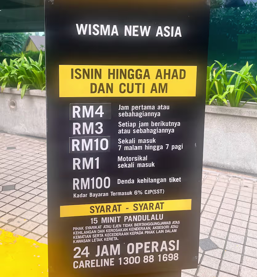 Wisma New Asia’s Parking Rate Notice Share Copy URLWhatsAppFacebookXLinkedinEmail Last Updated On April 4, 2026 More Info Upload New Name *Email Address *Upload File(s) *Drag and Drop (or) Choose FilesSubmit Share Copy URLWhatsAppFacebookXLinkedinEmail Nearby car parks is only for subscribers. More info here Subscribe Notify of new follow-up comments new replies to my comments Label {} [+] Name* Email* Label {} [+] Name* Email* 0 Comments Oldest Newest Most Voted Inline Feedbacks View all comments Info Is 15 Minutes Grace Period Included in the First Hour of Parking? What Is Cut-Off Time in a Parking Rate Notice RM10.00 or RM20.00 Charged Instead of Normal Parking Rate? Can You Use Your Bankcard To Exit Parking If Your T&G Card Has Insufficient Balance? Can you use MyKad’s TnG for parking payments?