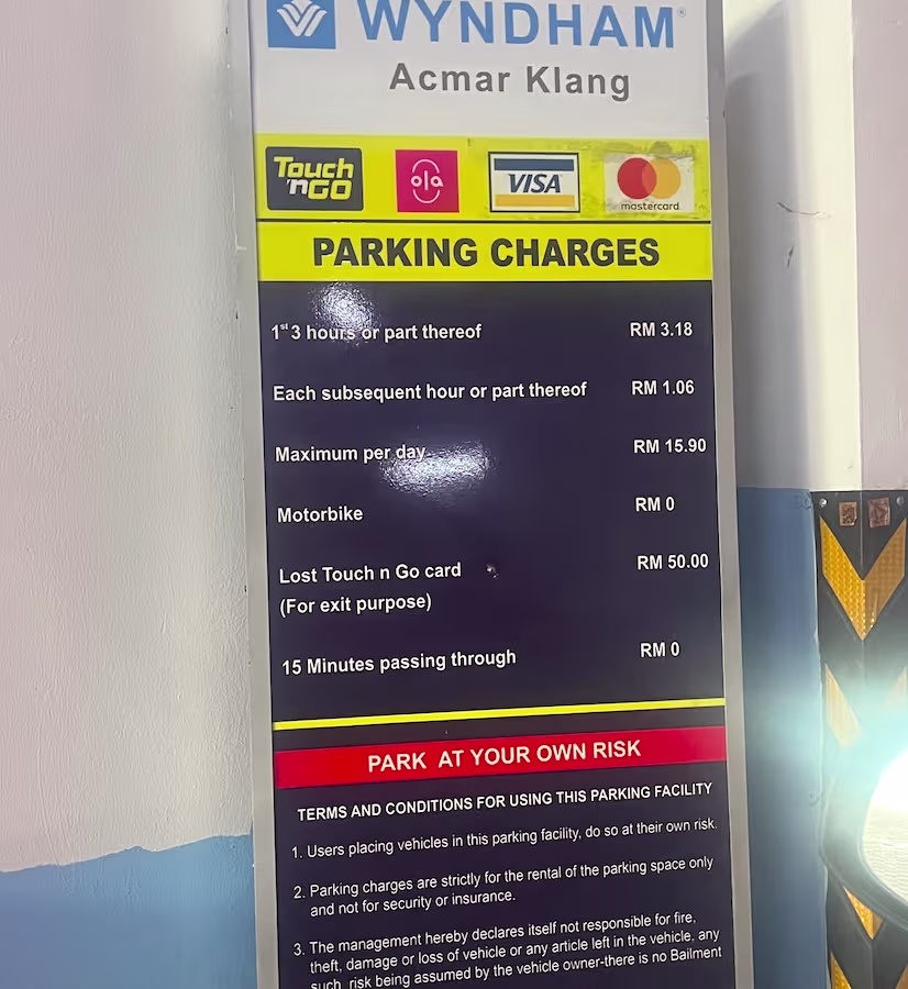 Wyndham Acmar Klang’s Parking Rate Notice Share Copy URLWhatsAppFacebookXLinkedinEmail Last Updated On November 22, 2025 Basement © parkinginmalaysia.com Outdoor © parkinginmalaysia.com Back Upload New Name *Email Address *Upload File(s) *Drag and Drop (or) Choose FilesSubmit Share Copy URLWhatsAppFacebookXLinkedinEmail Nearby car parks is only for subscribers. More info here Subscribe Notify of new follow-up comments new replies to my comments Label {} [+] Name* Email* Label {} [+] Name* Email* 0 Comments Oldest Newest Most Voted Inline Feedbacks View all comments Info Is 15 Minutes Grace Period Included in the First Hour of Parking? What Is Cut-Off Time in a Parking Rate Notice RM10.00 or RM20.00 Charged Instead of Normal Parking Rate? Can You Use Your Bankcard To Exit Parking If Your T&G Card Has Insufficient Balance? Can you use MyKad’s TnG for parking payments?